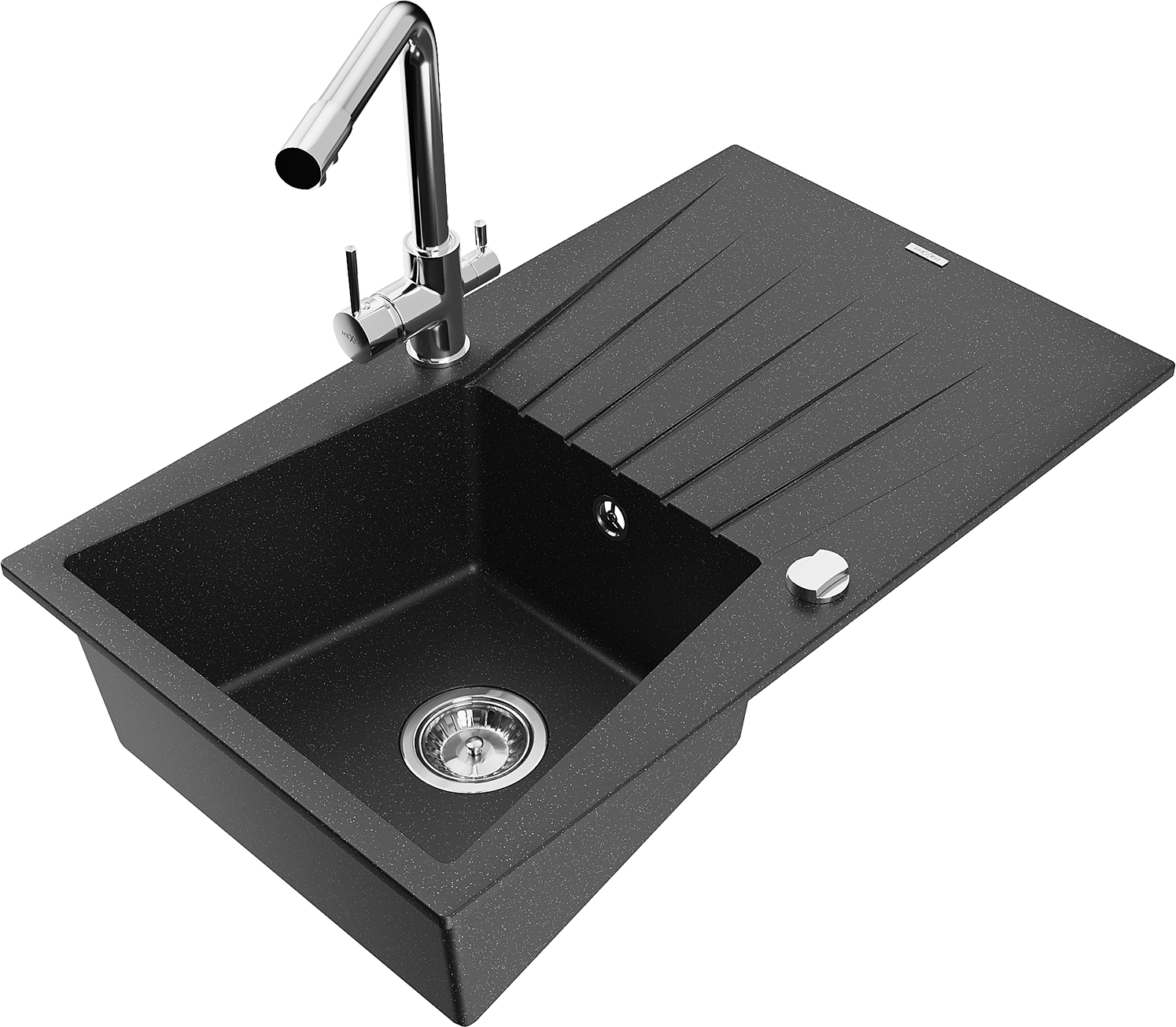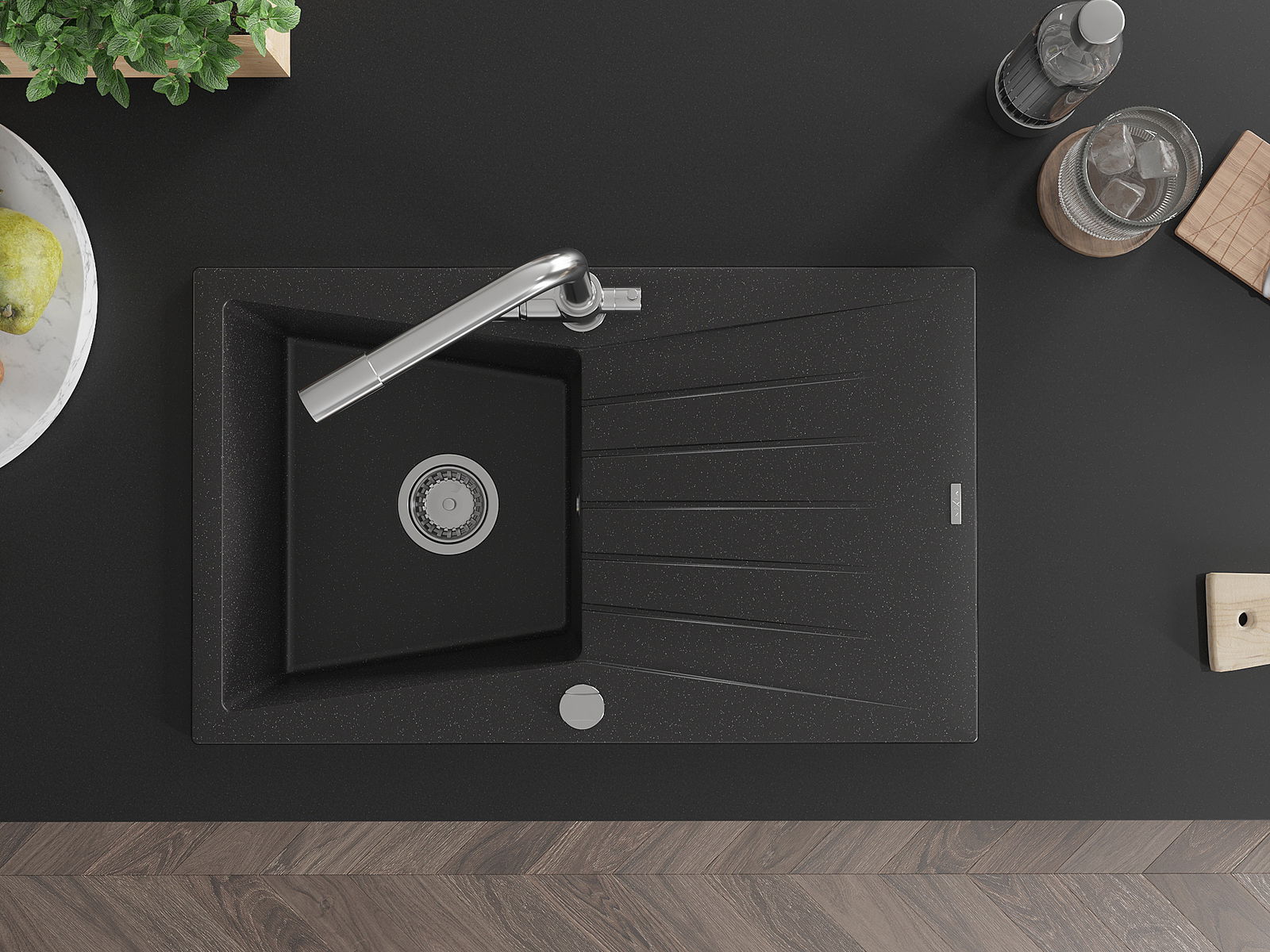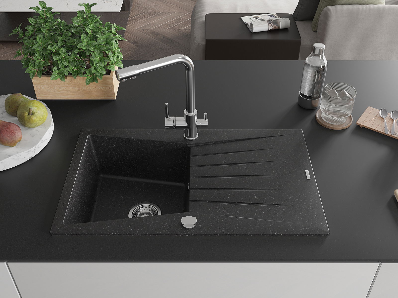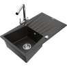 Mexen Cesar évier en granit 1 bac avec égouttoir et robinet de cuisine Duero, noir/métallique argenté - 6514-73-671600-00