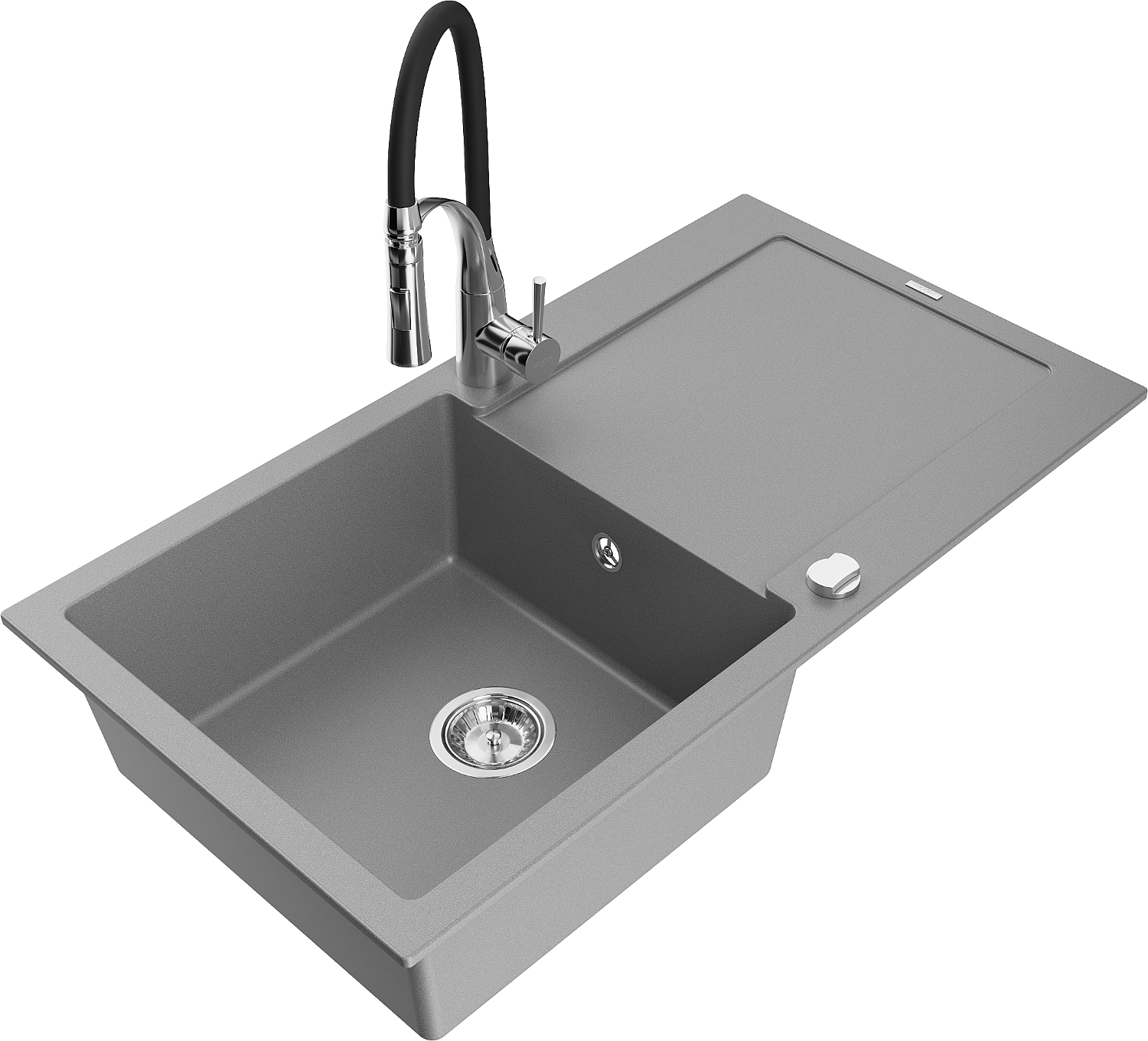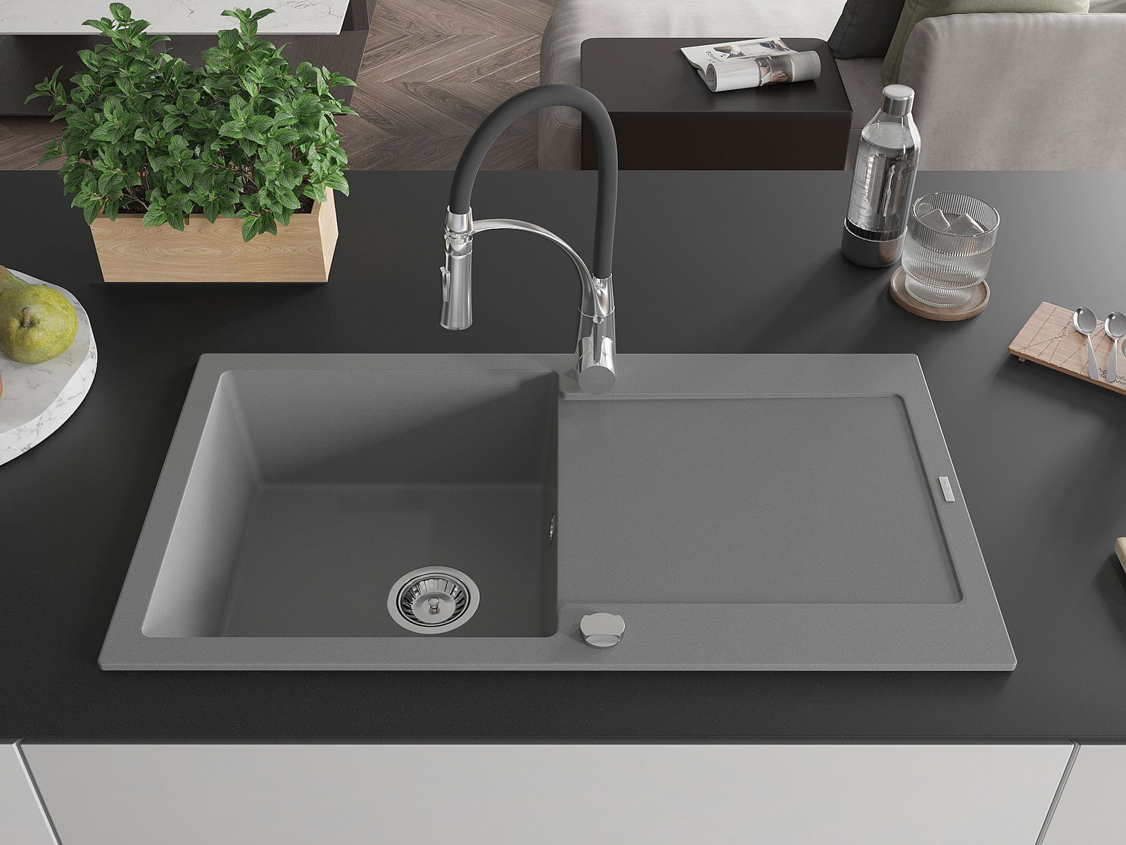 Mexen Leo évier en granit 1 bac avec égouttoir et robinet de cuisine Aster, gris - 6501-71-73450-07
