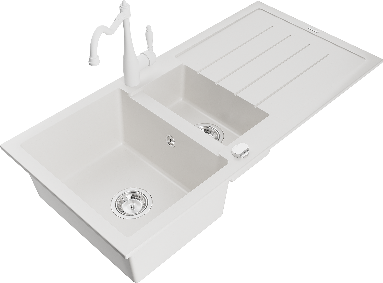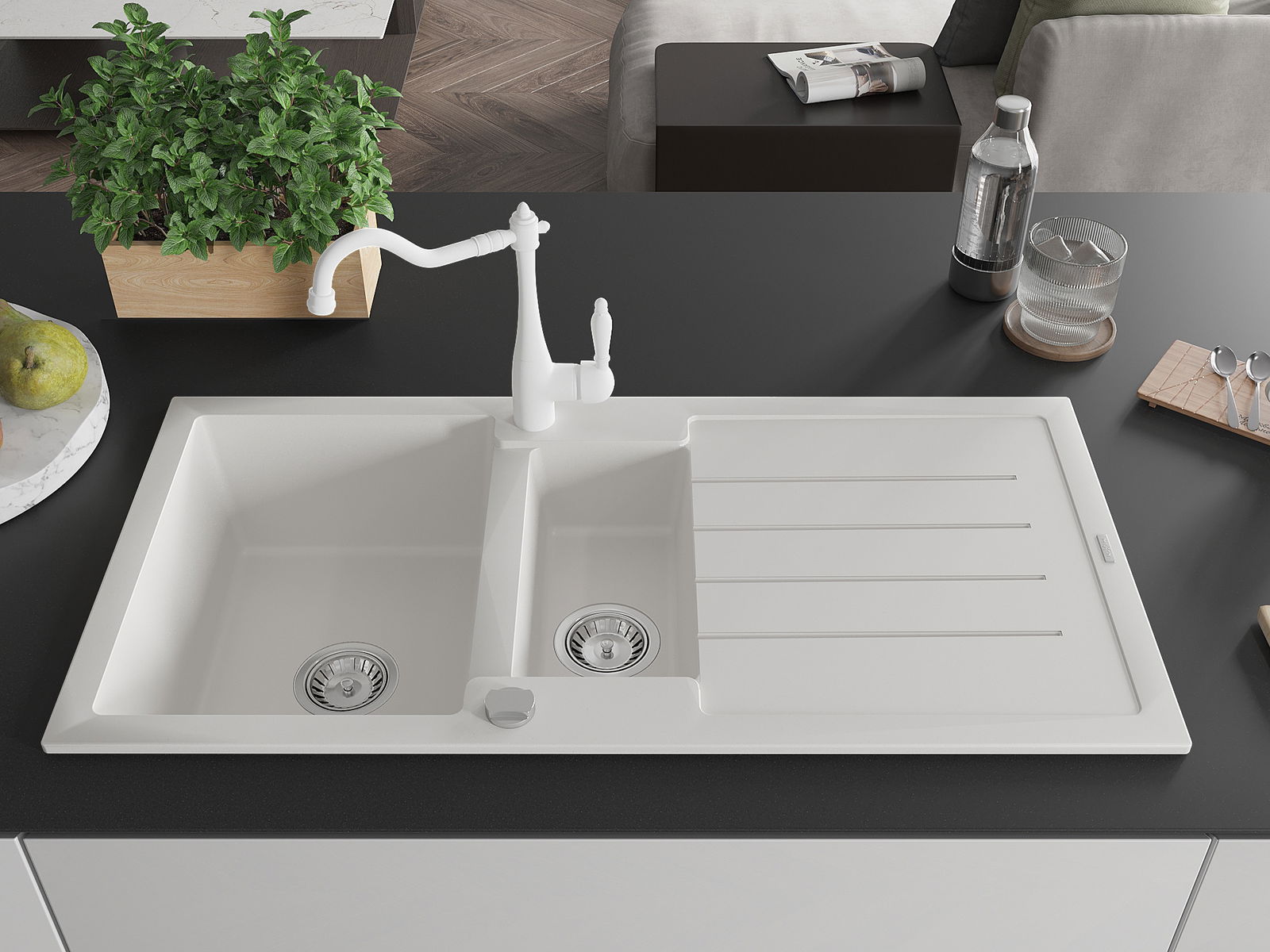 Mexen Andres évier en granit 1,5 bac avec égouttoir et mitigeur de cuisine Carla, blanc - 6515-20-670700-20