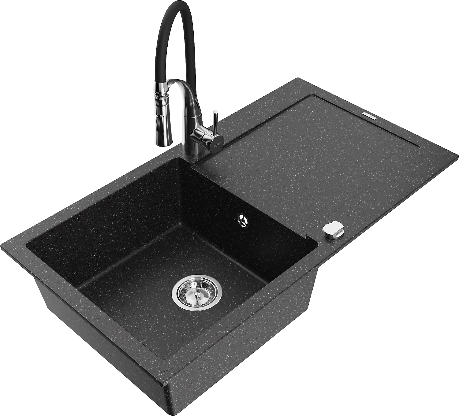 Mexen Leo évier en granit 1 bac avec égouttoir et robinet de cuisine Aster, noir/métallisé argenté - 6501-73-73450-07