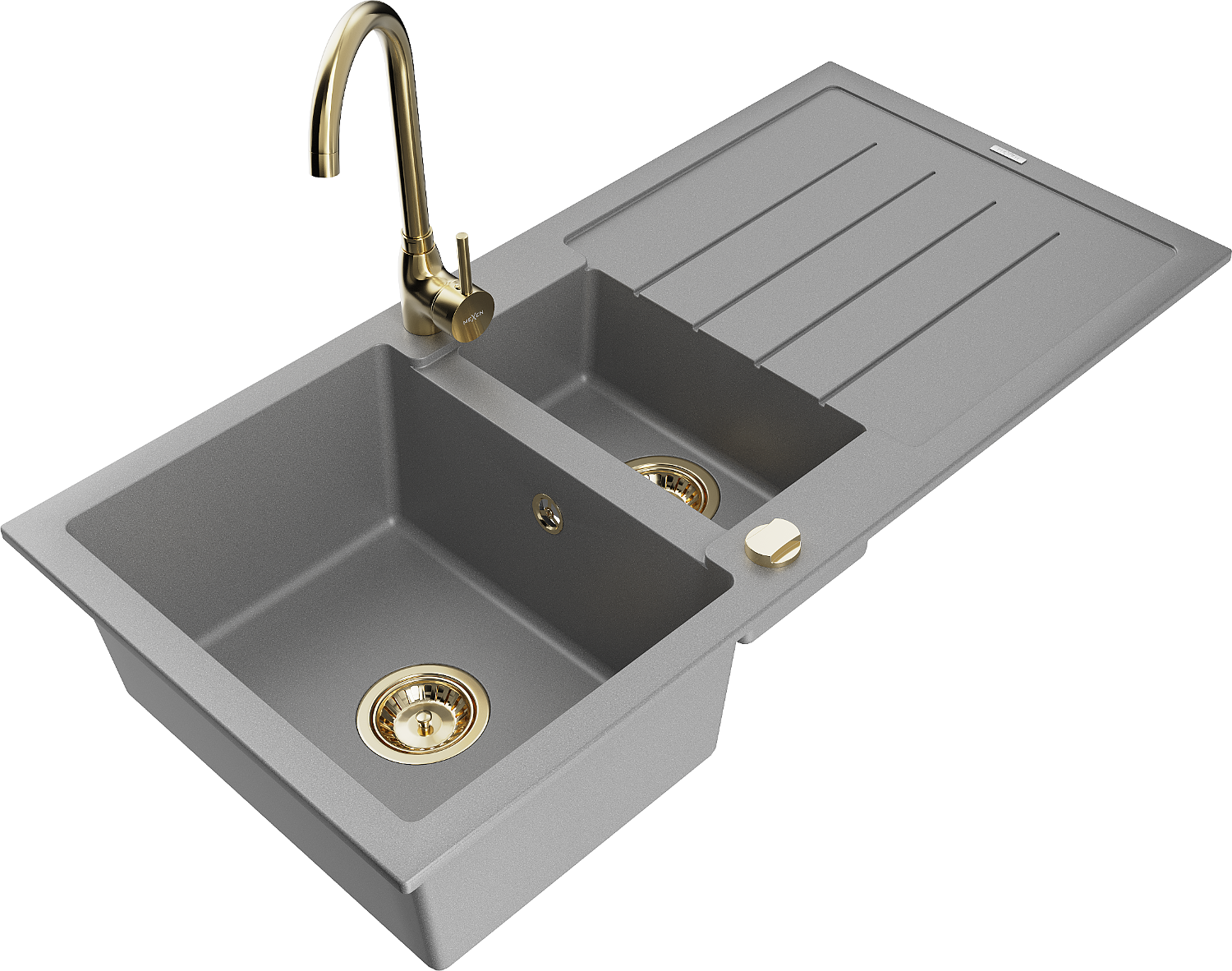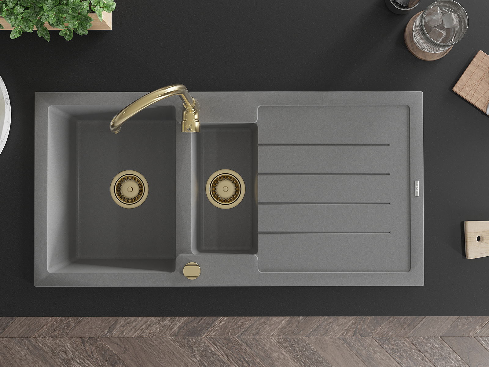 Mexen Andres évier en granit 1,5 bac avec égouttoir et robinet de cuisine Telma, gris - 6515-71-670200-50