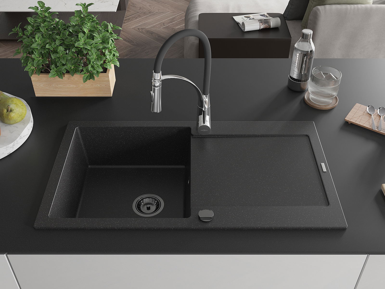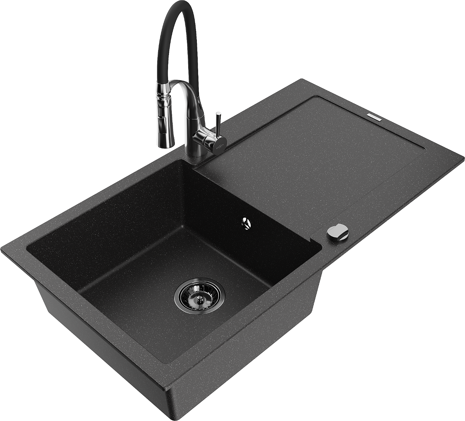 Mexen Leo évier en granit 1 bac avec égouttoir et robinet de cuisine Aster, noir/argent métallisé - 501-73-73450-07-B