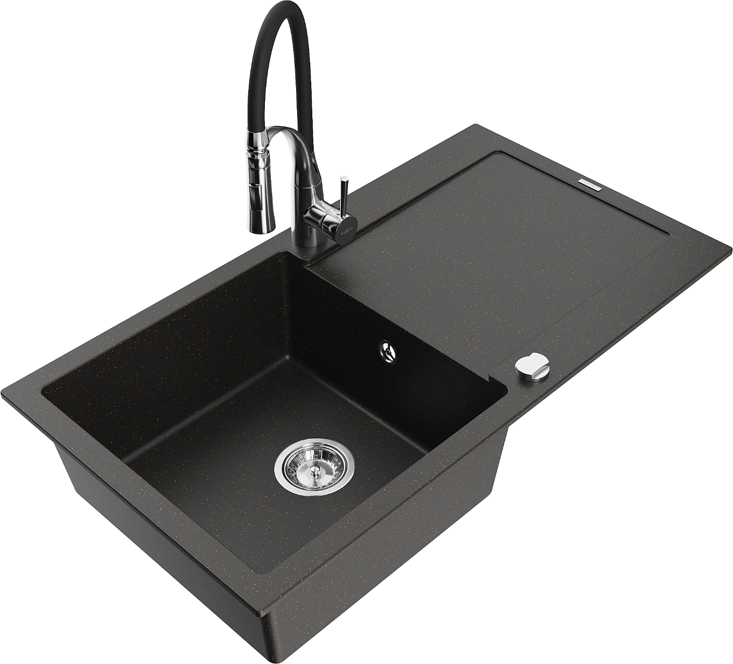 Mexen Leo évier en granit à 1 bac avec égouttoir et robinet de cuisine Aster, noir/doré métallisé - 6501-75-73450-07