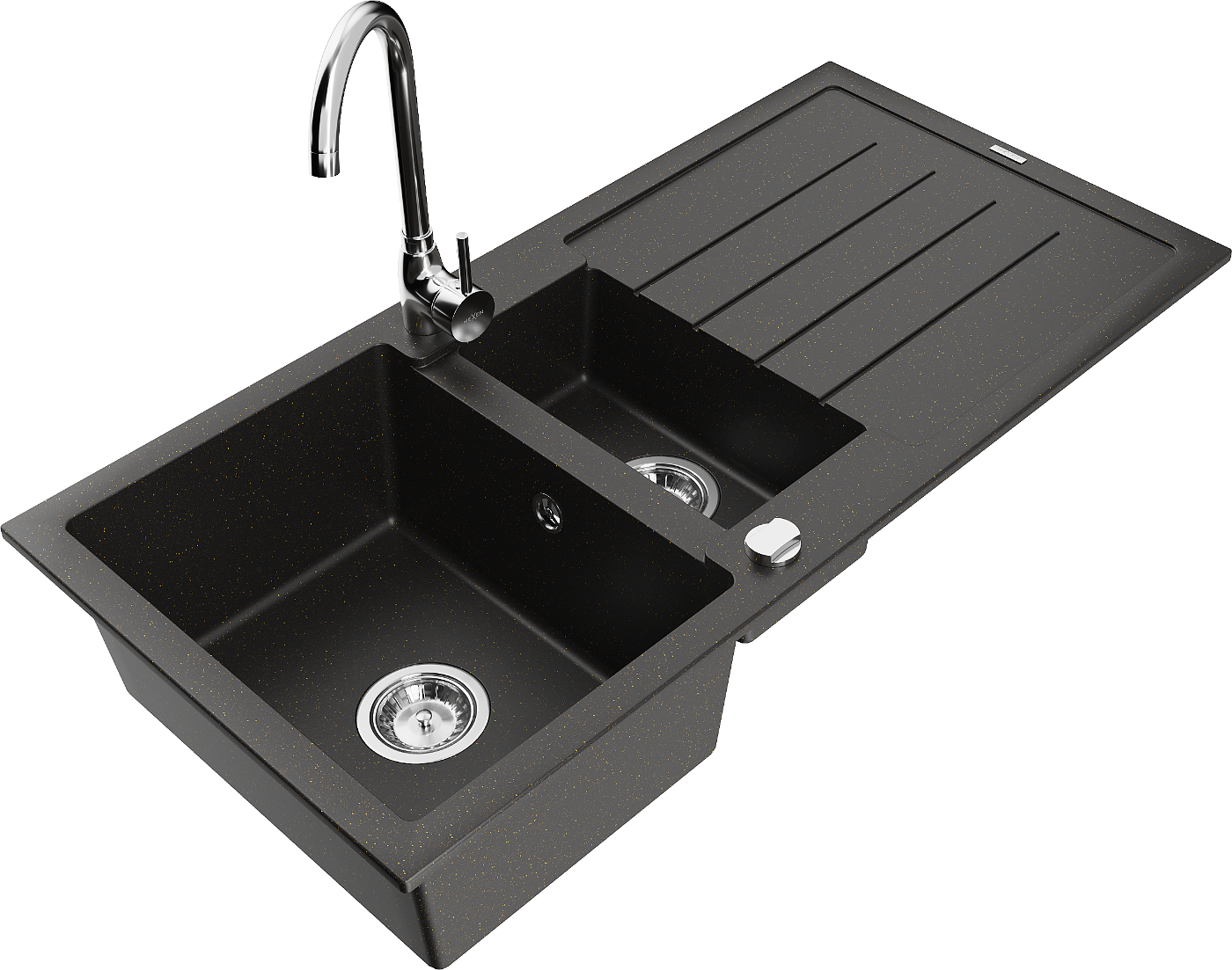 Mexen Andres évier en granit 1,5 bac avec égouttoir et robinet de cuisine Telma, noir/or - 6515-75-670200-00