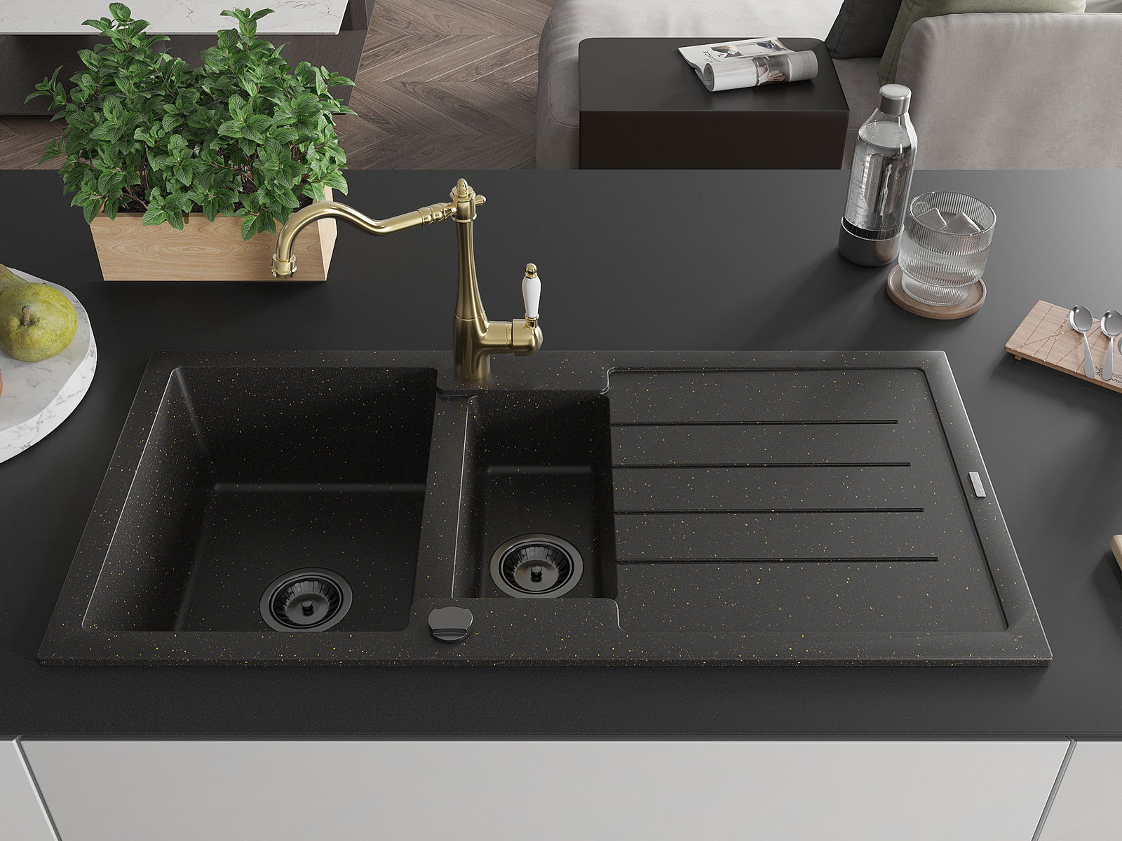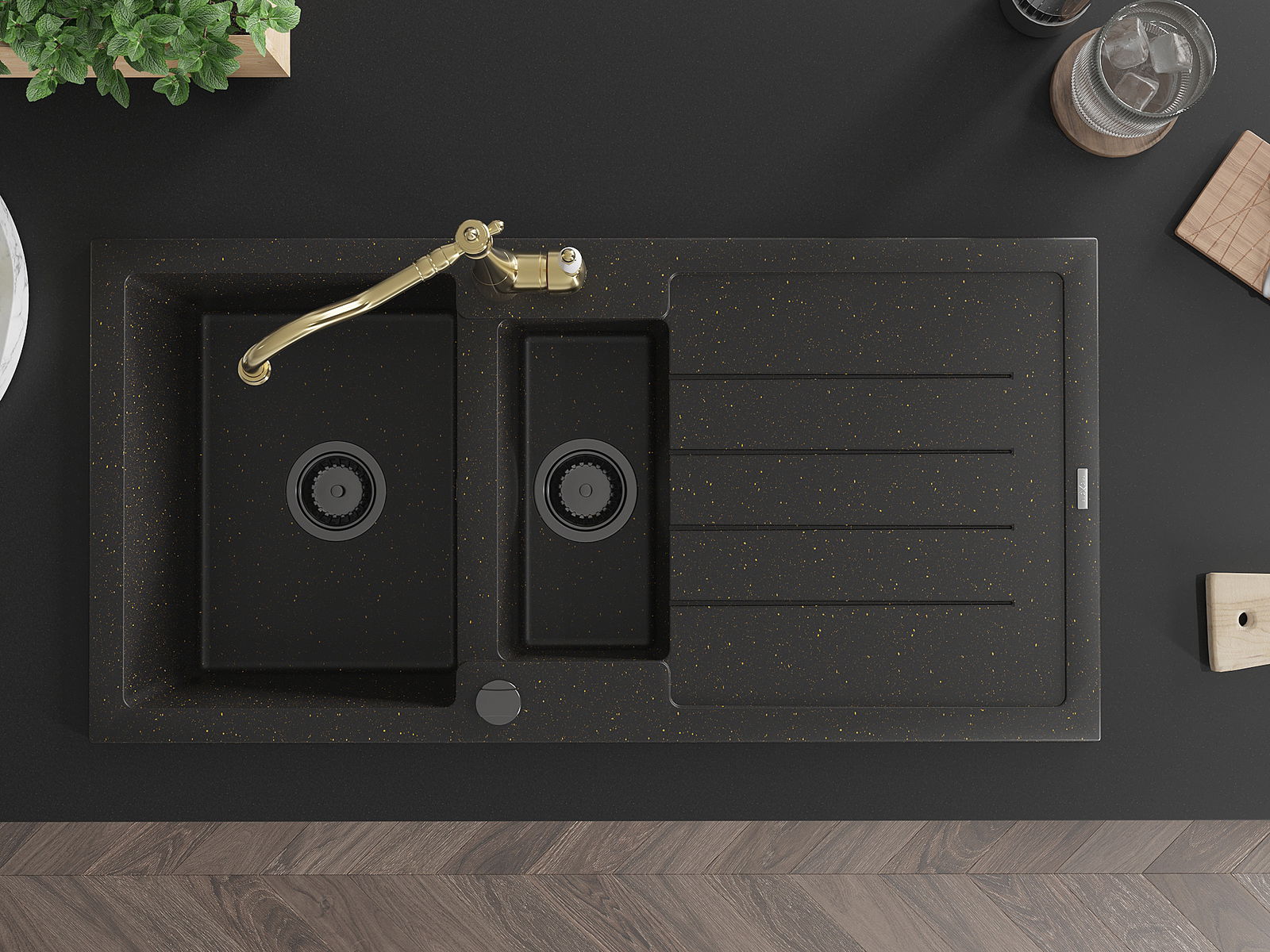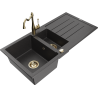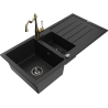 Mexen Andres évier en granit 1,5 bac avec égouttoir et robinet de cuisine Carla, noir/or - 6515-75-670700-50-B