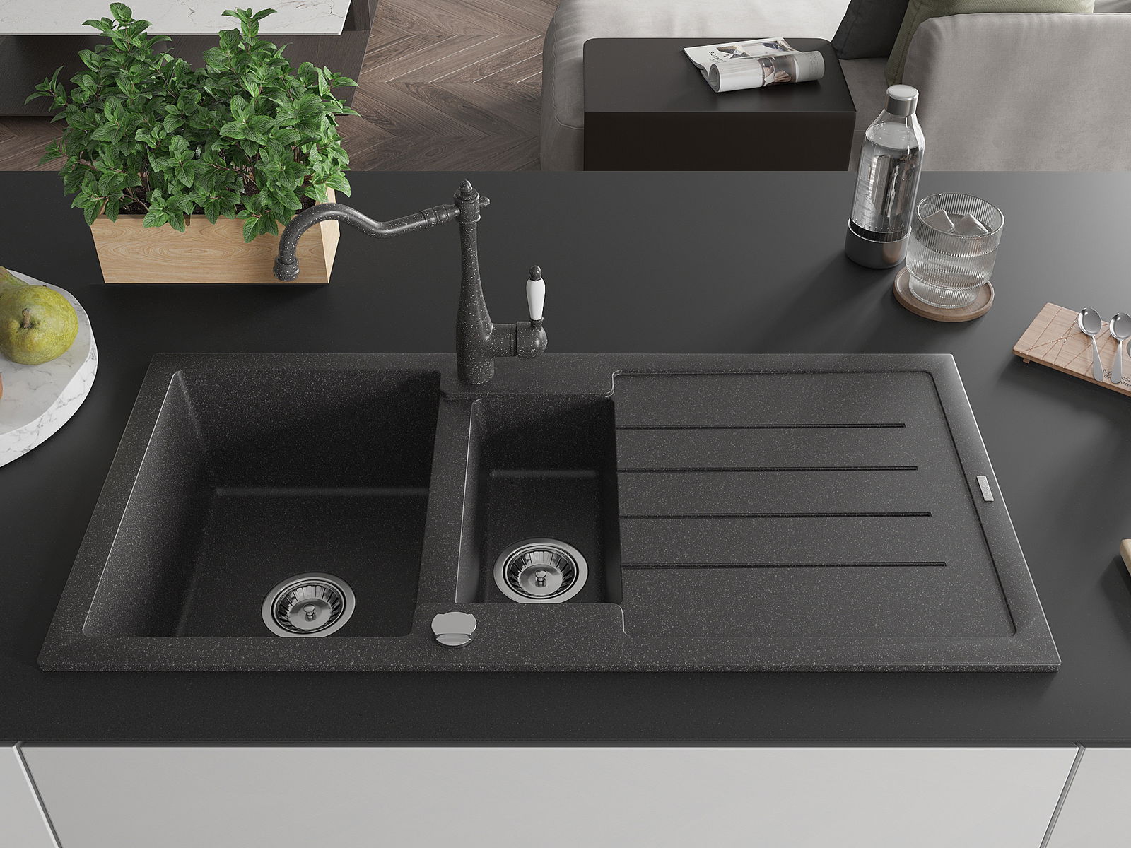Mexen Andres évier en granit 1,5 bac avec égouttoir et robinet de cuisine Carla, noir moucheté - 6515-76-670700-76
