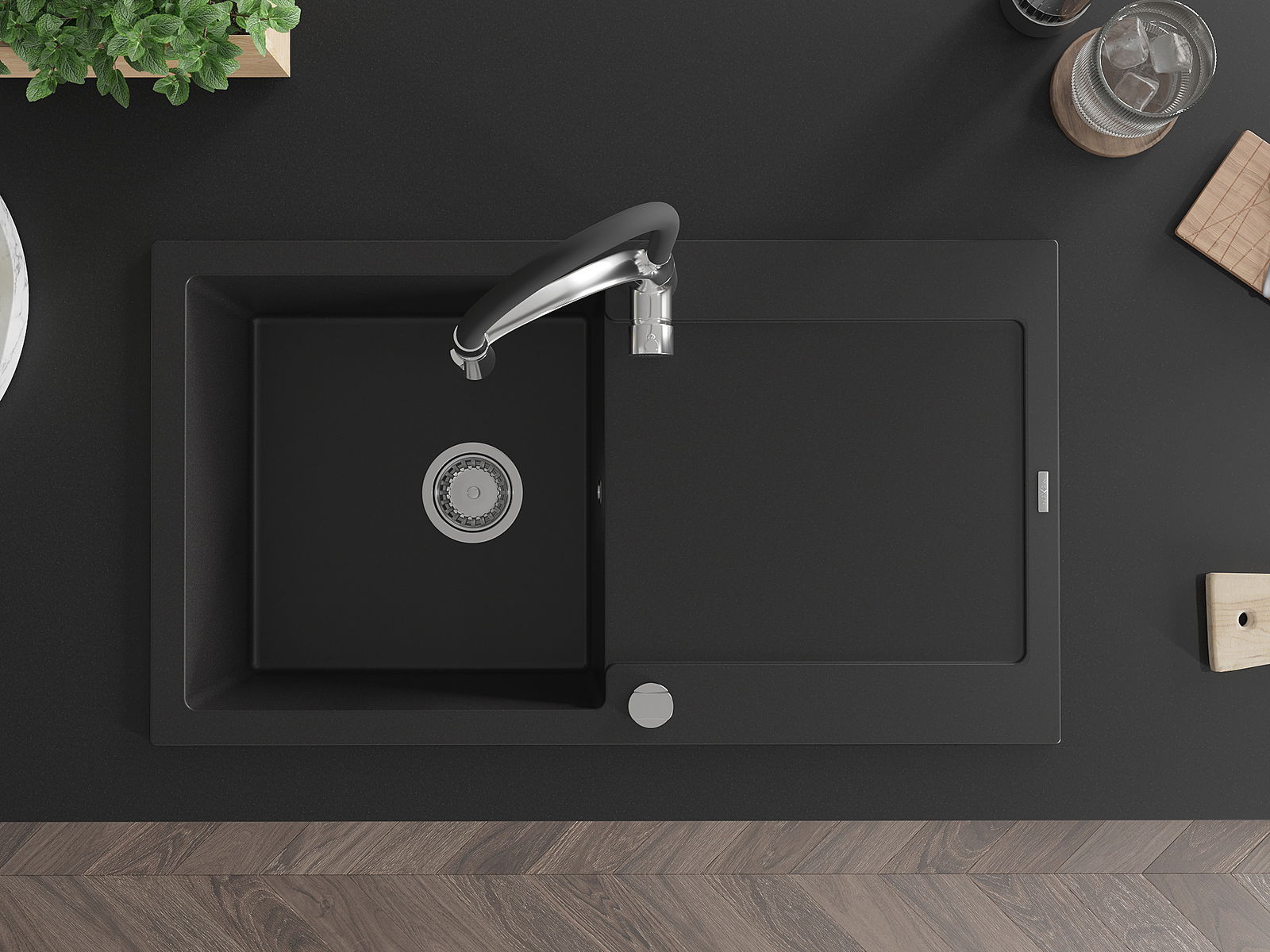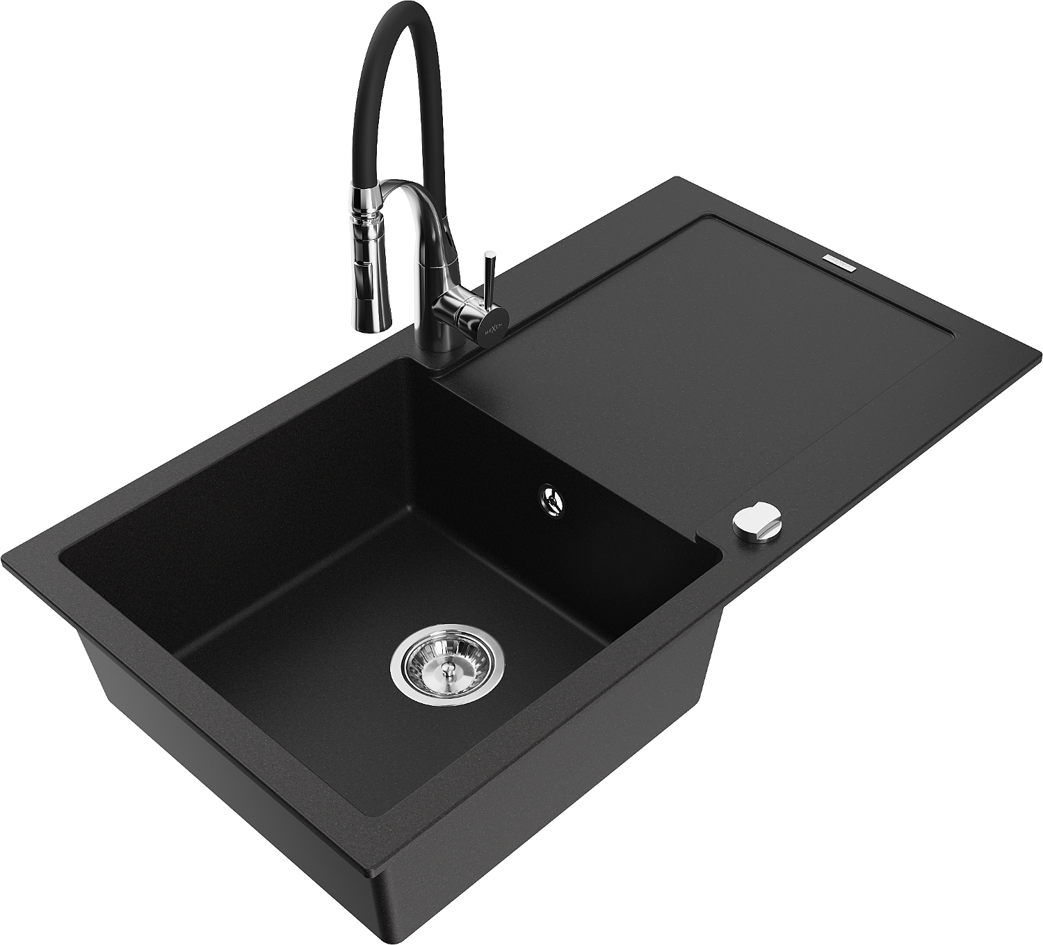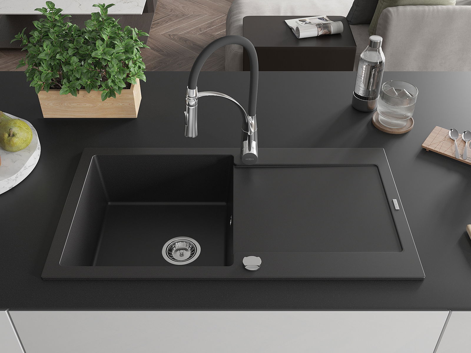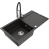Mexen Leo évier en granit 1 bac avec égouttoir et robinet de cuisine Aster, noir - 6501-77-73450-07