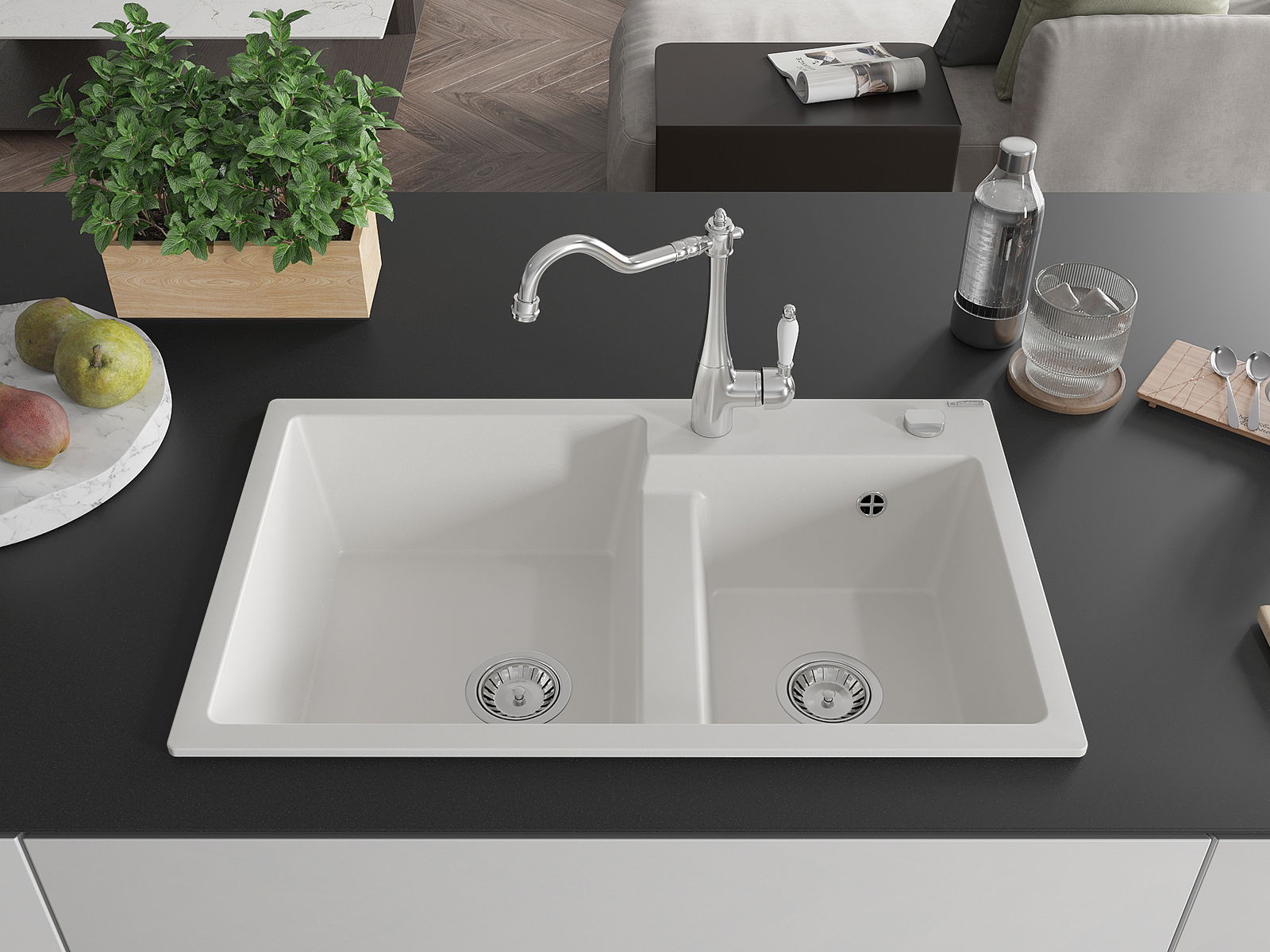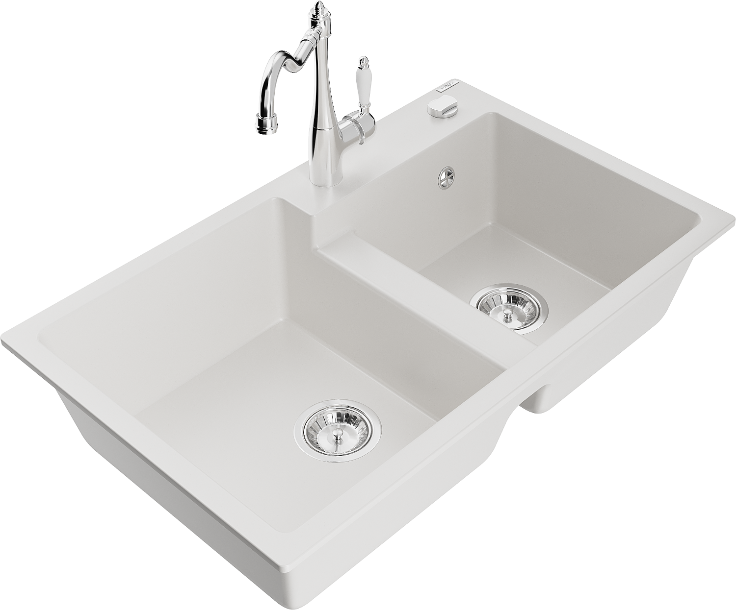 Mexen Tomas évier en granit 2 bacs avec robinet de cuisine Carla, blanc - 6516-20-670700-00