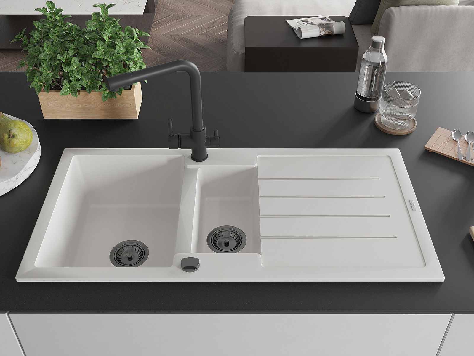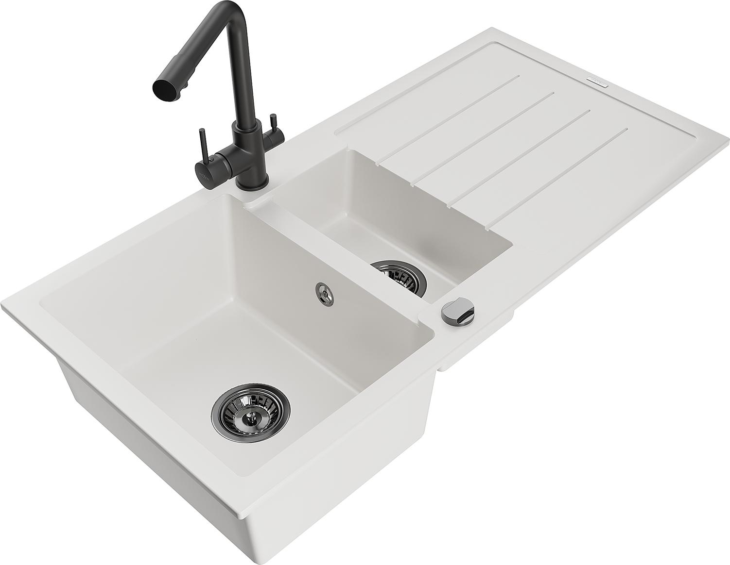 Mexen Andres évier en granit 1,5 bac avec égouttoir et robinet de cuisine Duero, blanc - 6515-20-671600-70