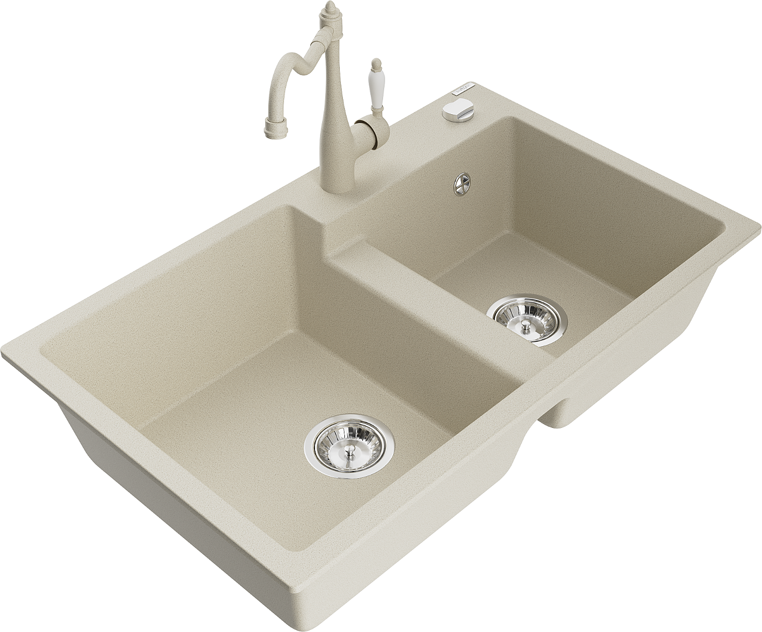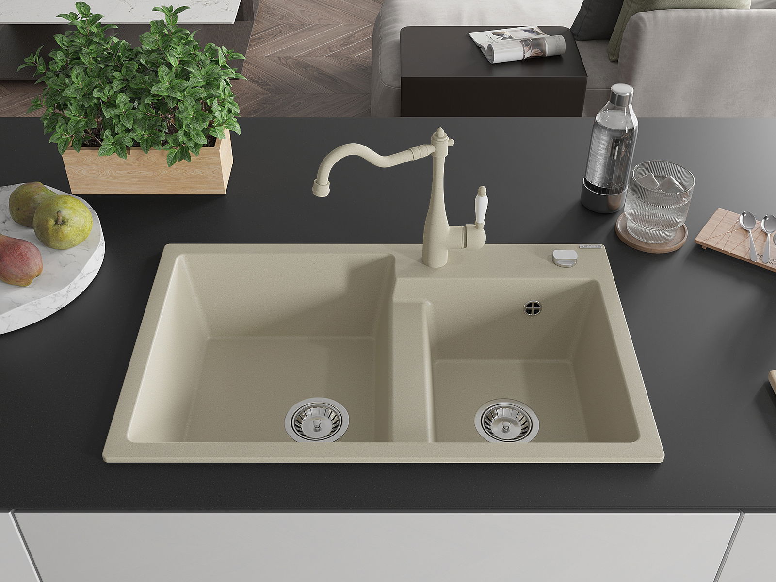 Mexen Tomas évier en granit 2 bacs avec robinet de cuisine Carla, beige - 6516-69-670700-69