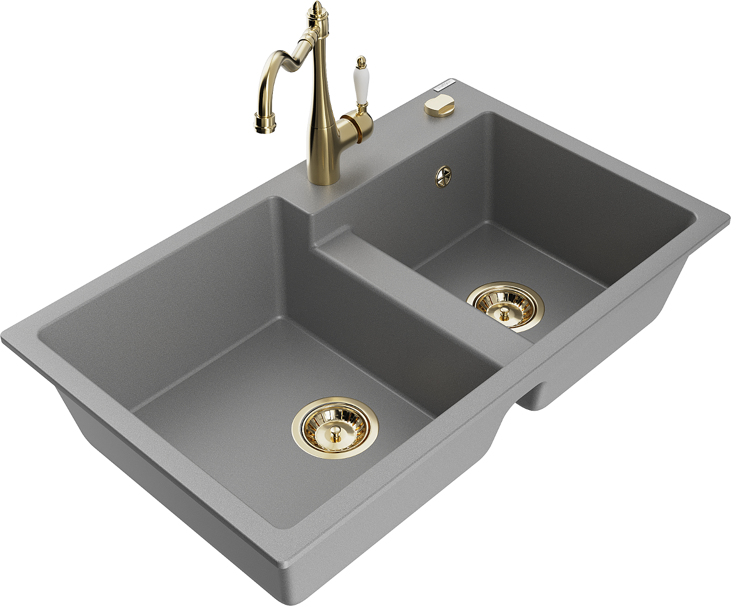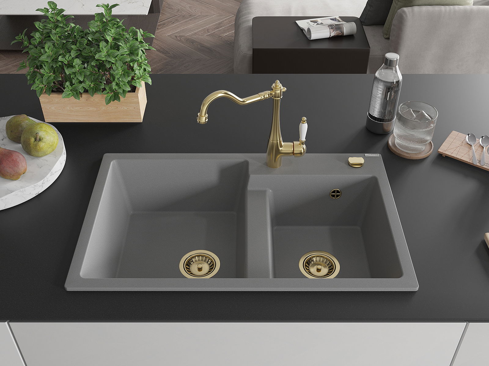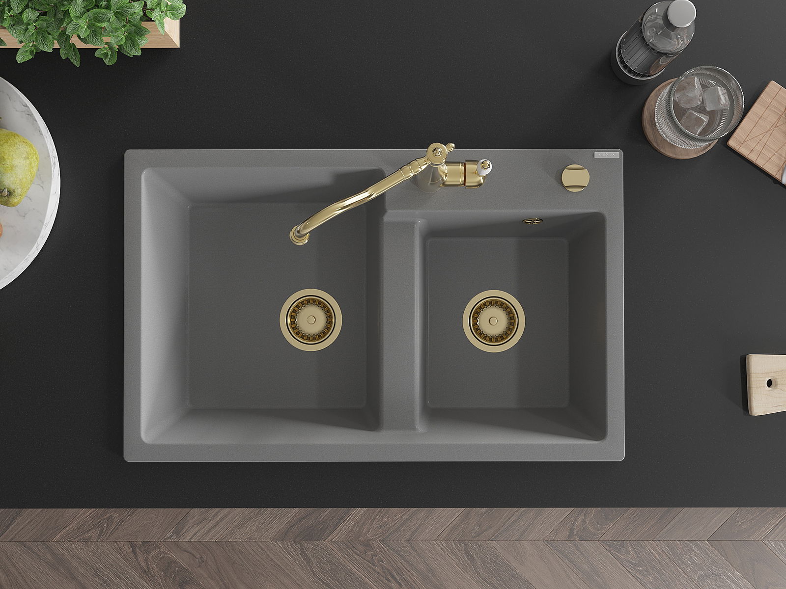 Mexen Tomas évier en granit à 2 bacs avec robinet de cuisine Carla, gris - 6516-71-670700-50