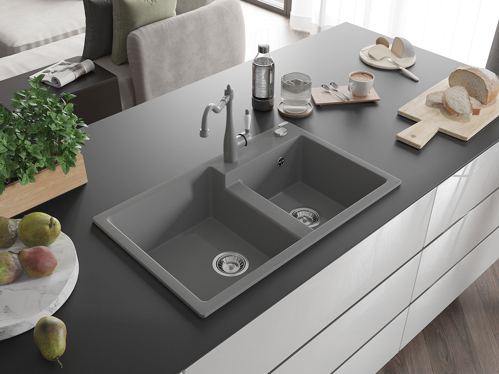 Mexen Tomas évier en granit 2 bacs avec robinet de cuisine Carla, gris - 6516-71-670700-71