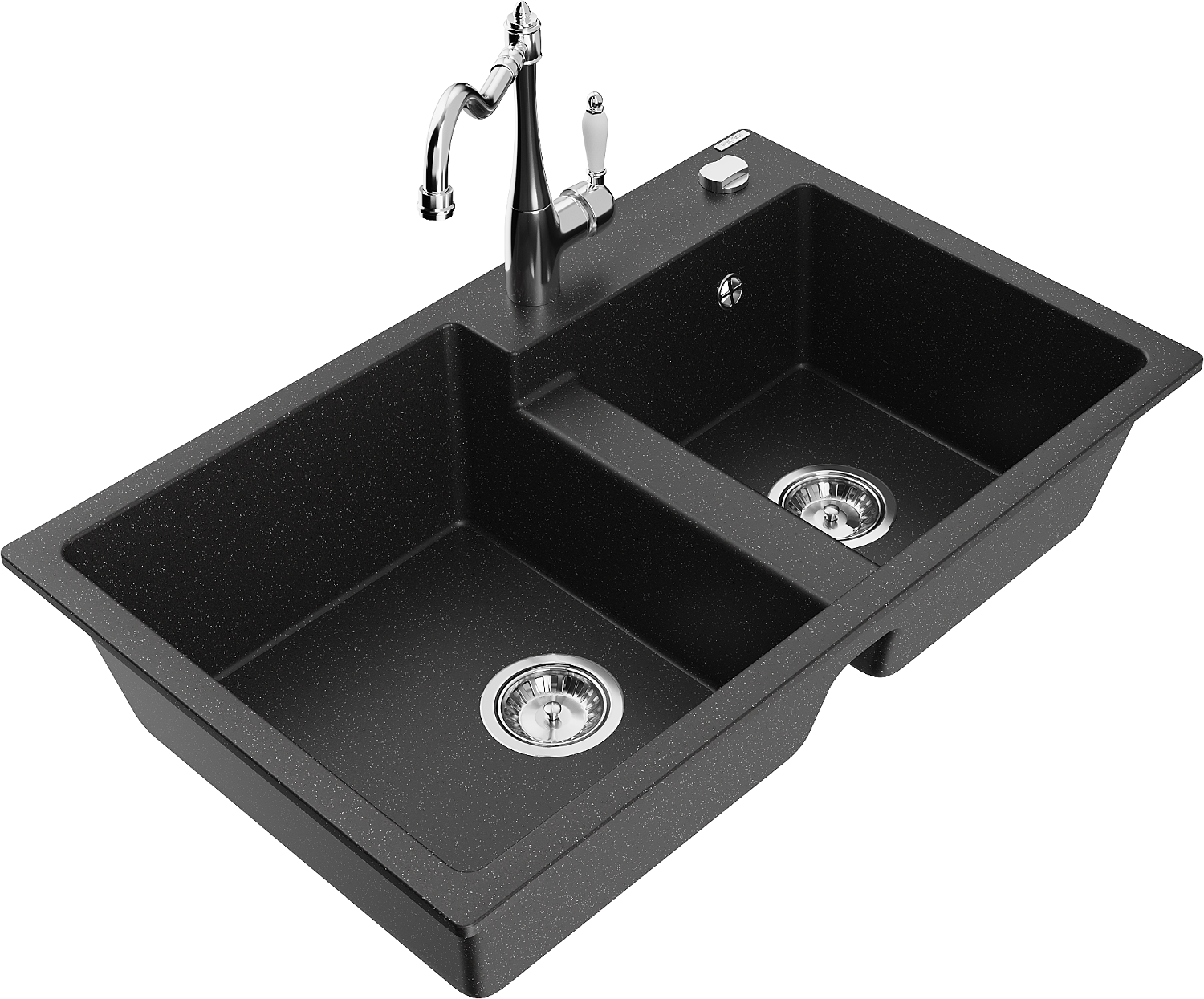 Mexen Tomas évier en granit à 2 bacs avec robinet de cuisine Carla, noir/métallique argent - 6516-73-670700-00