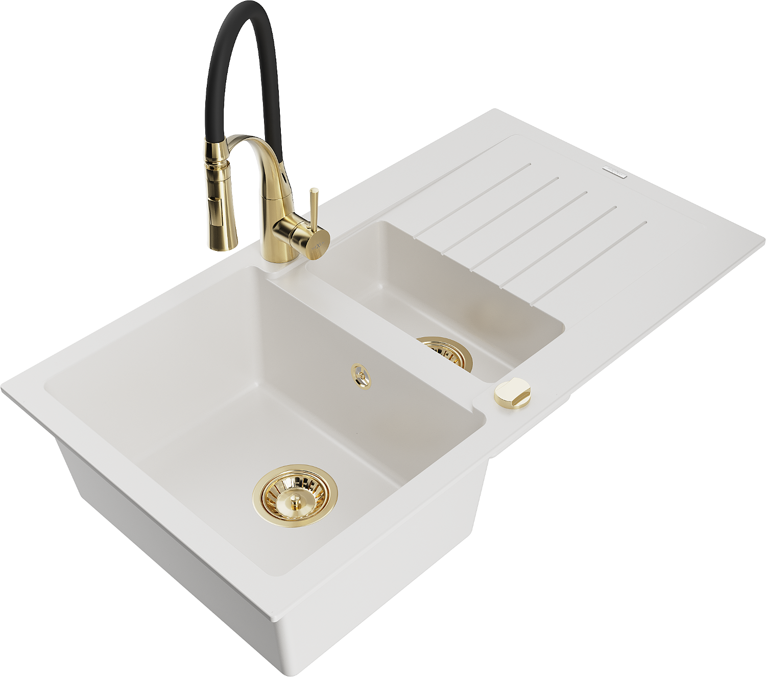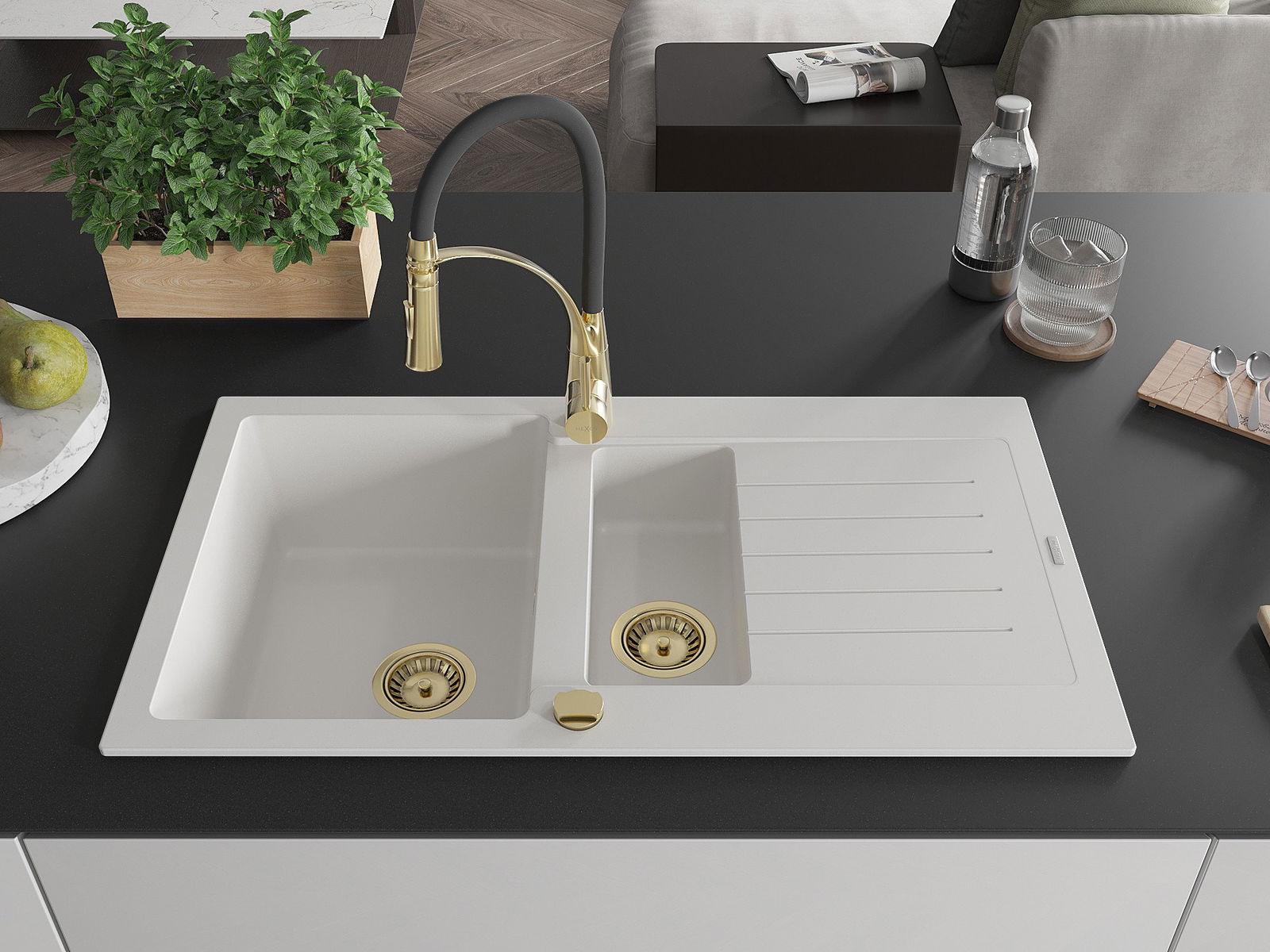 Mexen Matias évier en granit 1,5 bac avec égouttoir et robinet de cuisine Aster, blanc - 6502-20-73450-57-G