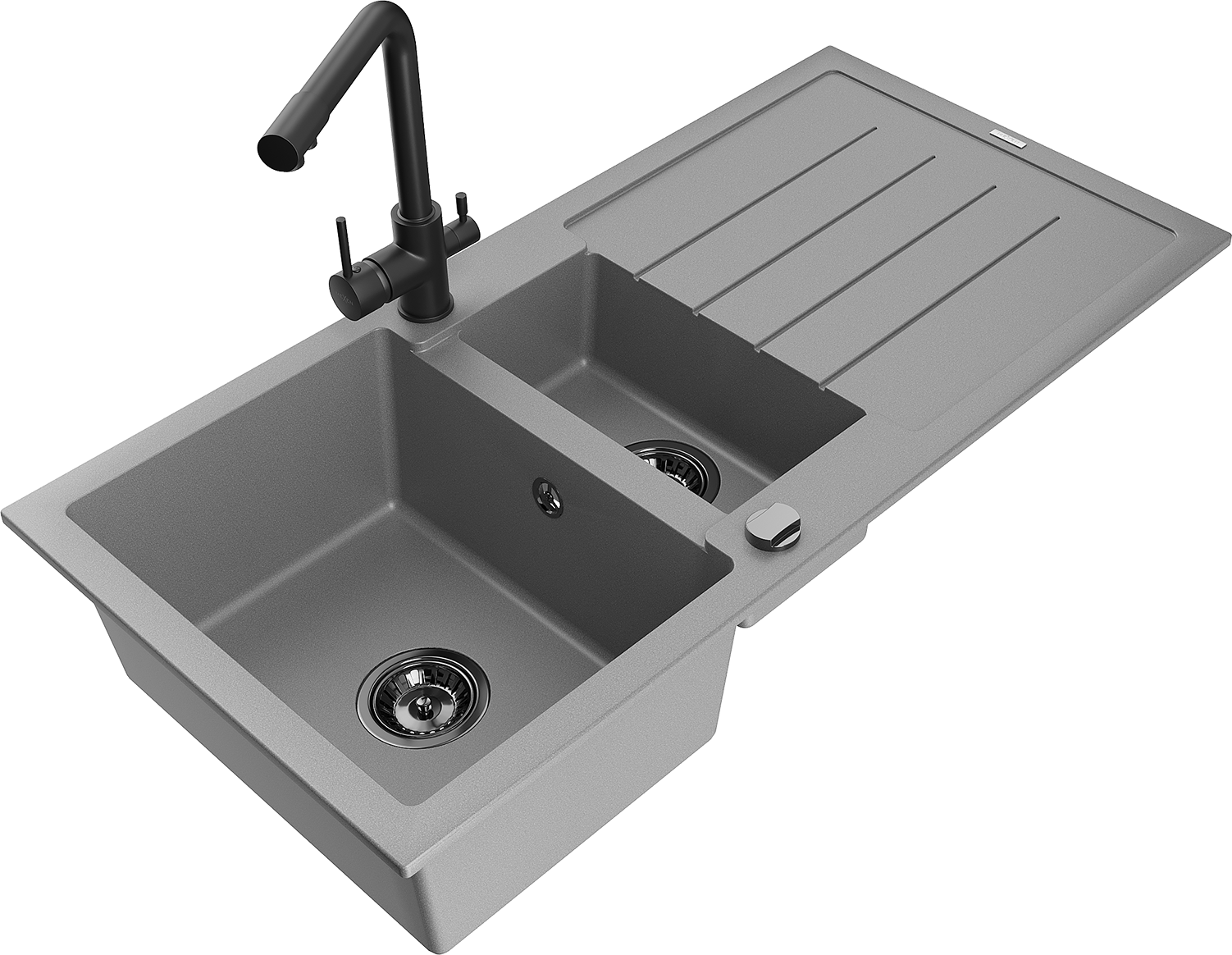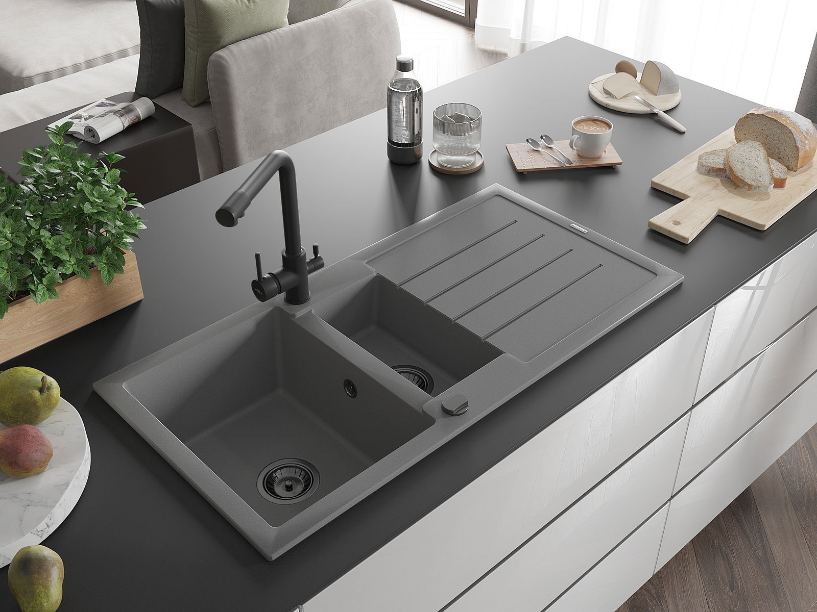 Mexen Andres évier en granit 1,5 bac avec égouttoir et robinet de cuisine Duero, gris - 6515-71-671600-70-B