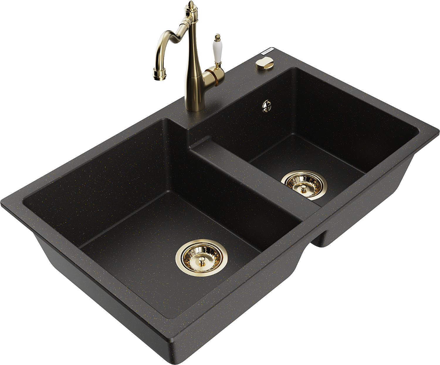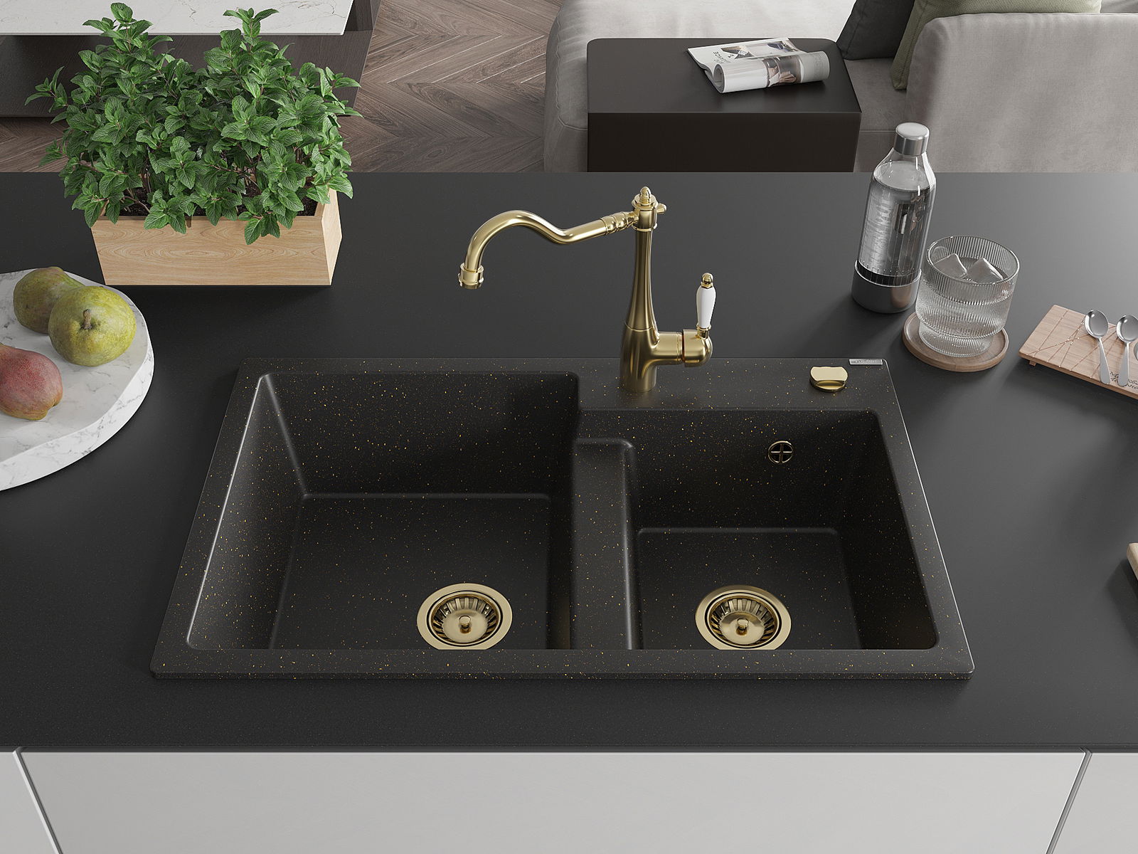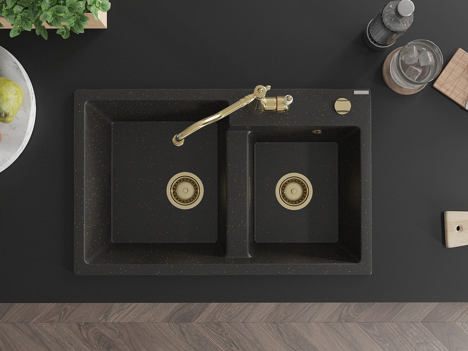 Mexen Tomas évier en granit à 2 bacs avec robinet de cuisine Carla, noir/doré métallisé - 6516-75-670700-50