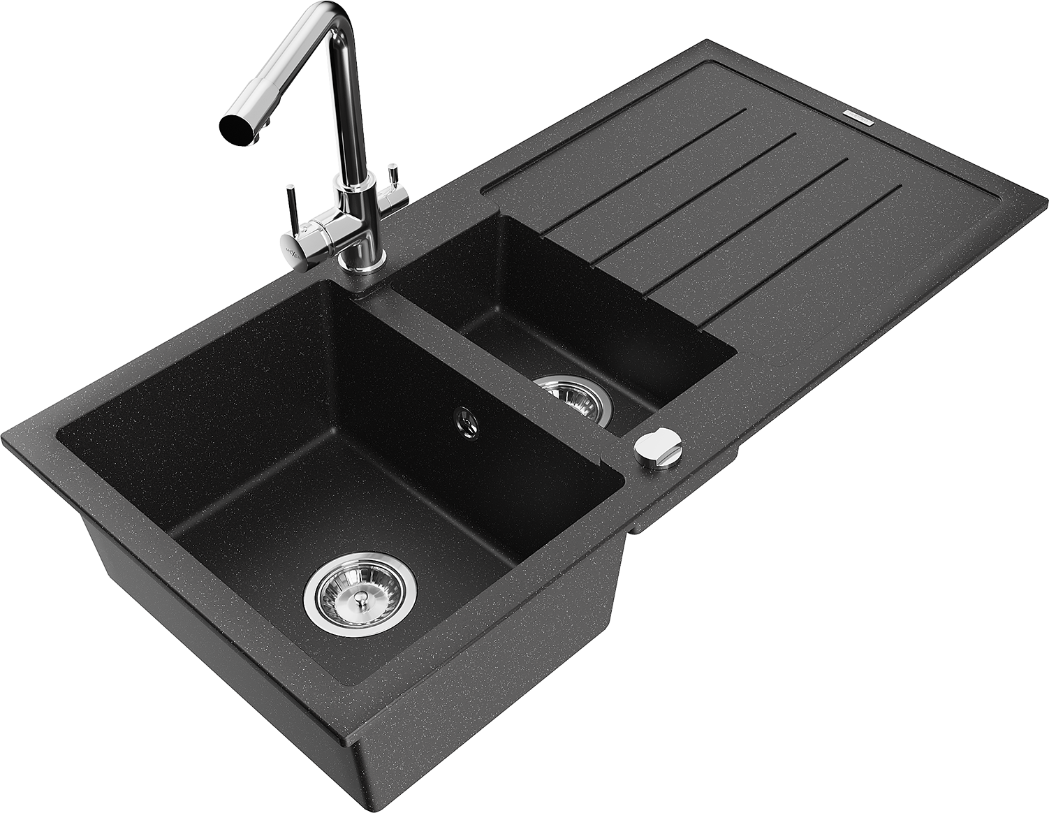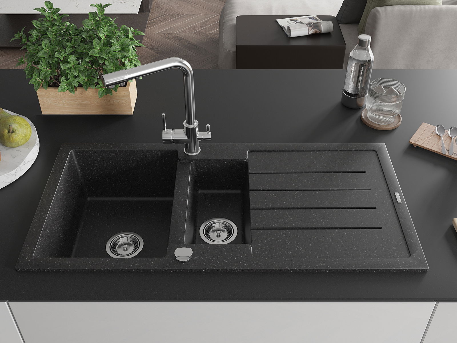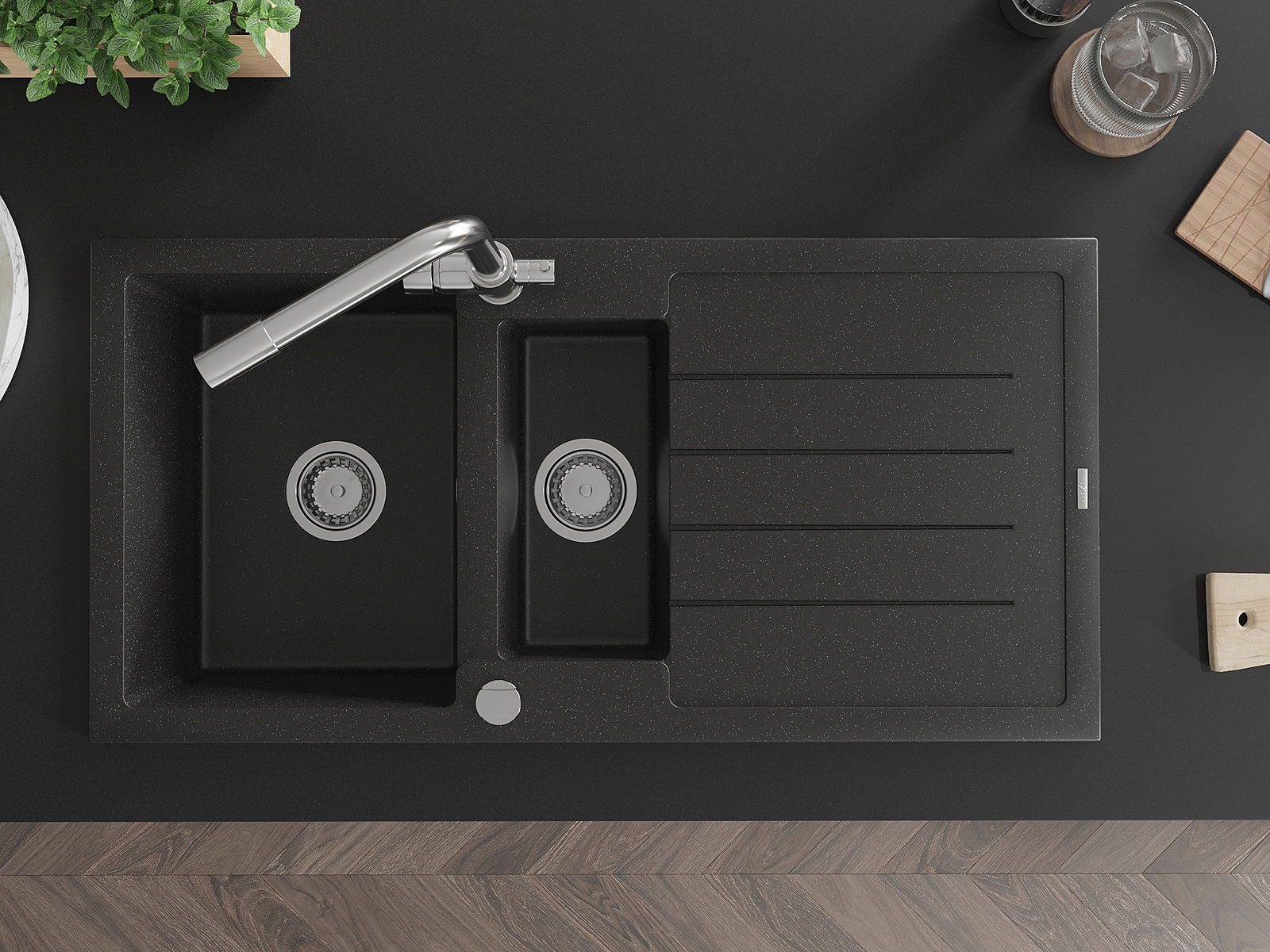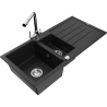 Mexen Andres évier en granit 1,5 bac avec égouttoir et robinet de cuisine Duero, noir/argent - 6515-73-671600-00