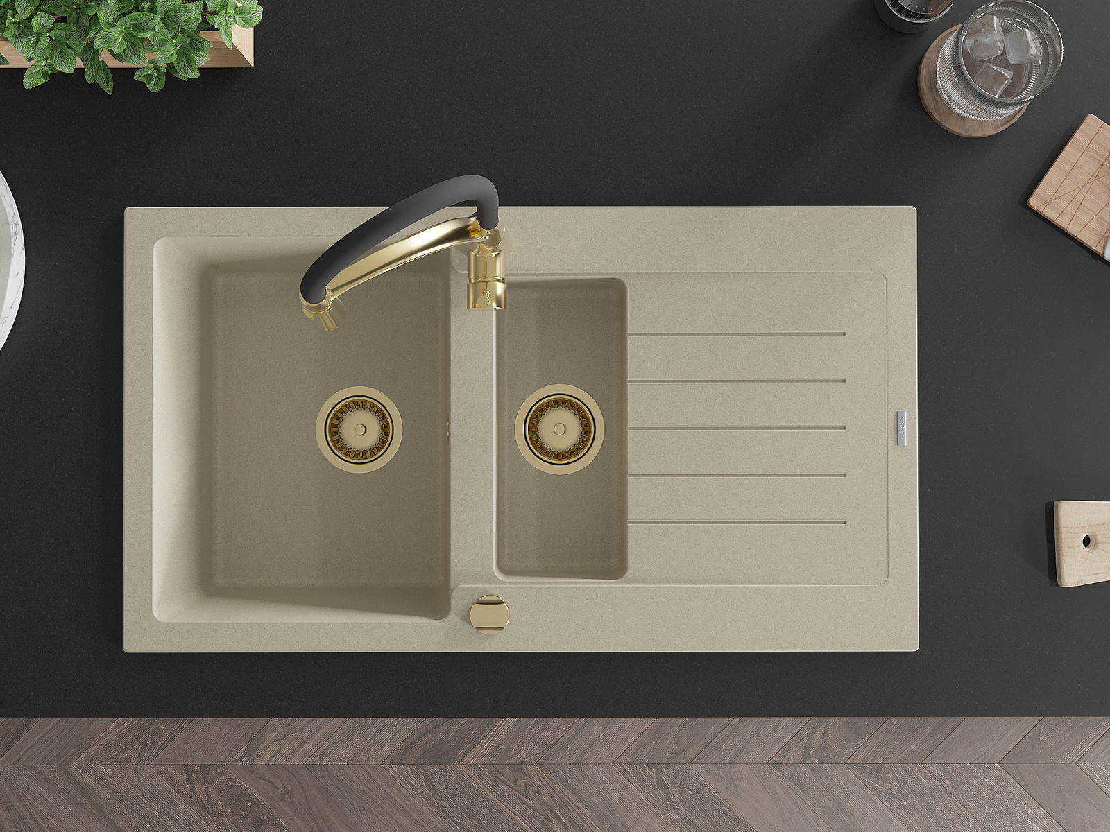 Mexen Matias évier en granit 1,5 bac avec égouttoir et robinet de cuisine Aster, beige - 6502-69-73450-57-G