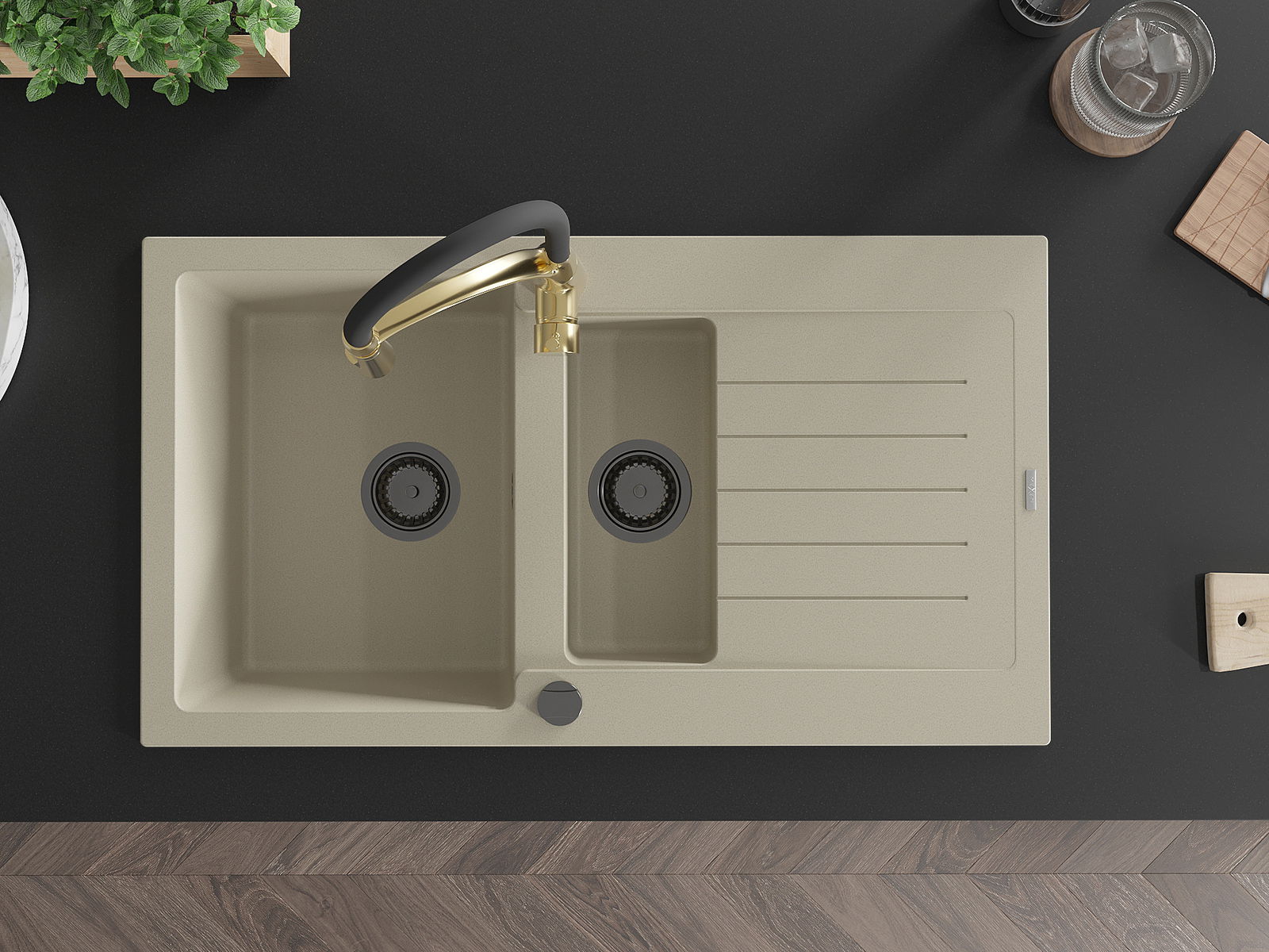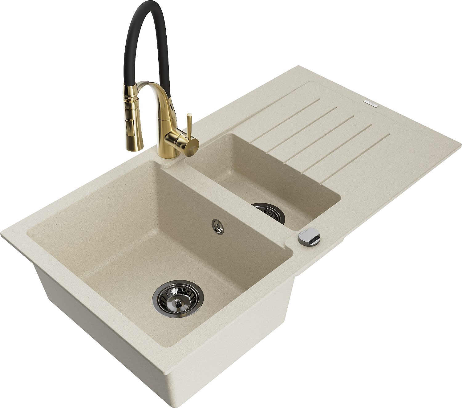 Mexen Matias évier en granit 1,5 bac avec égouttoir et mitigeur de cuisine Aster, beige - 6502-69-73450-57-B
