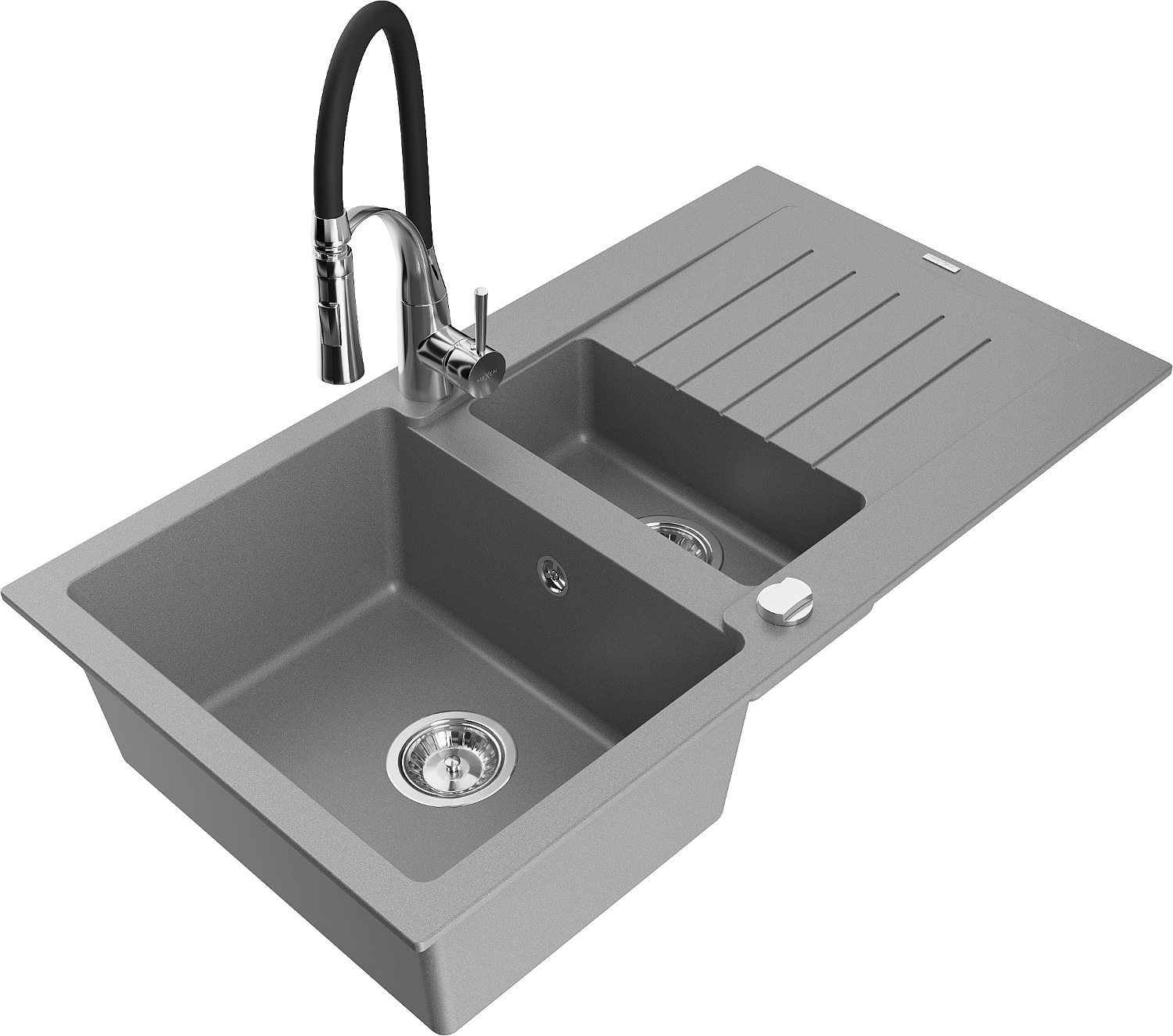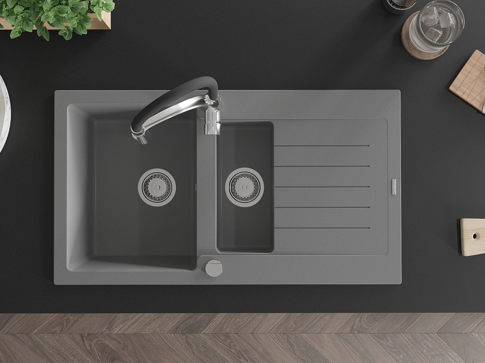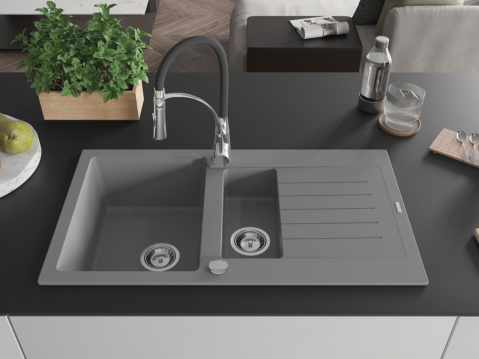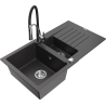 Mexen Matias évier en granit 1,5 bac avec égouttoir et robinet de cuisine Aster, gris - 6502-71-73450-07