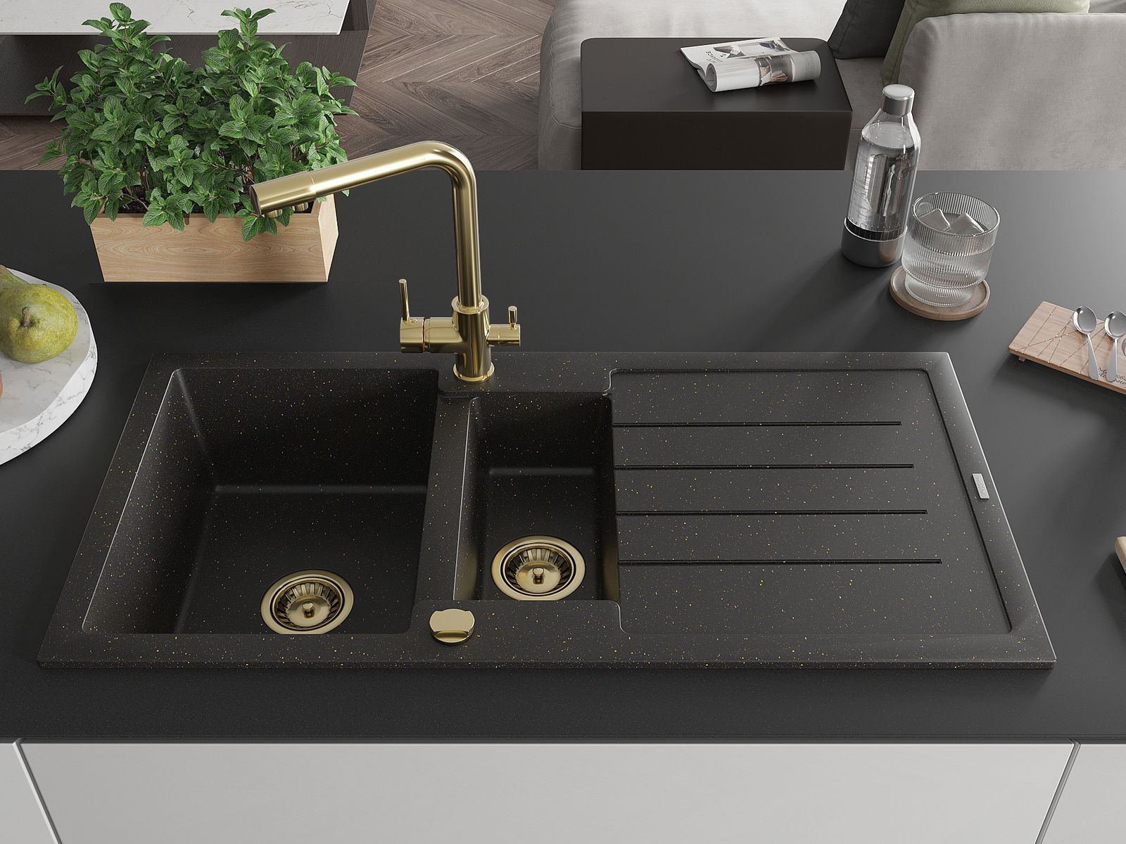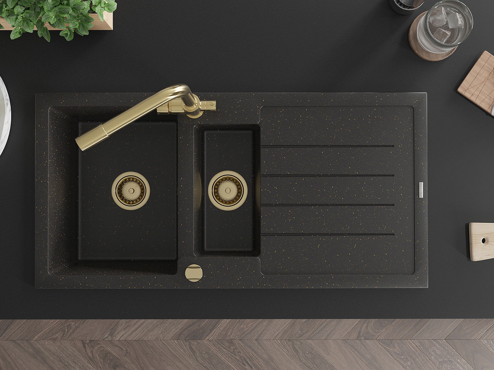Mexen Andres évier en granit 1,5 bac avec égouttoir et robinet de cuisine Duero, noir/or - 6515-75-671600-50
