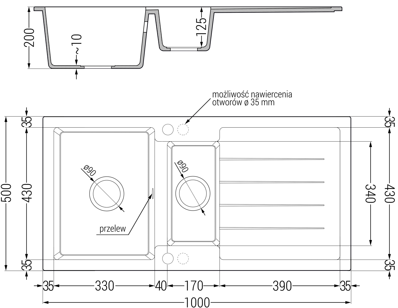 L'évier dispose de 2 trous pré-percés de 35 mm de diamètre, à percer soi-même. Ils peuvent être utilisés, entre autres, pour l'installation d'un distributeur de liquide, qui éliminera la présence de bouteilles en plastique dans la cuisine et lui donnera une finition élégante.
