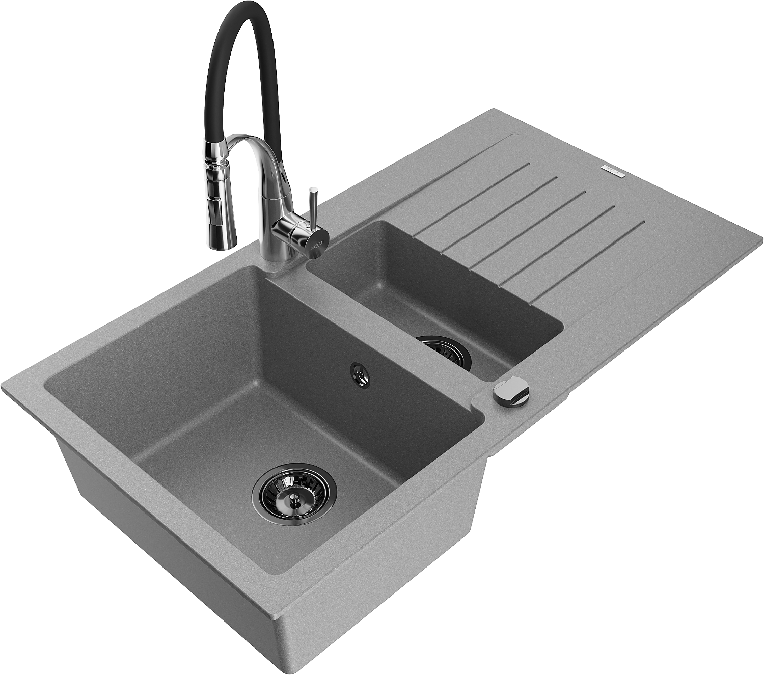 Mexen Matias évier en granit 1,5 bac avec égouttoir et robinet de cuisine Aster, gris - 6502-71-73450-07-B