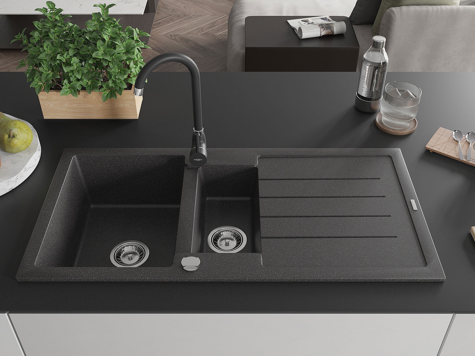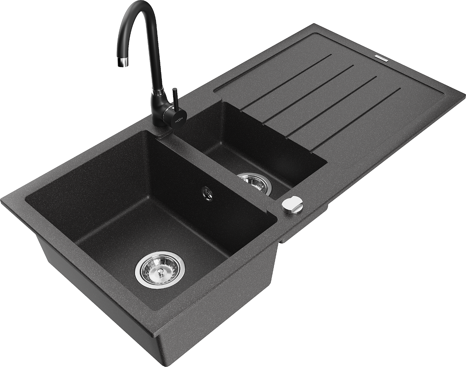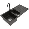 Mexen Andres évier en granit 1,5 bac avec égouttoir et mitigeur de cuisine Telma, noir moucheté - 6515-76-670200-70