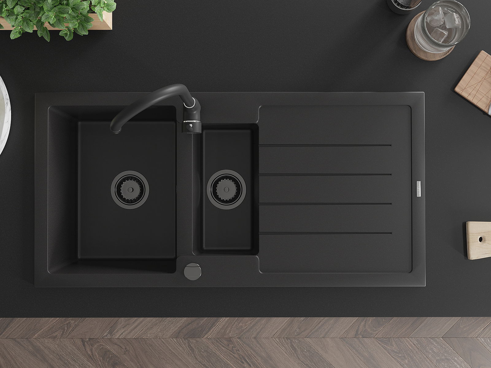 Mexen Andres évier en granit 1,5 bac avec égouttoir et mitigeur de cuisine Telma, noir - 6515-77-670200-70-B
