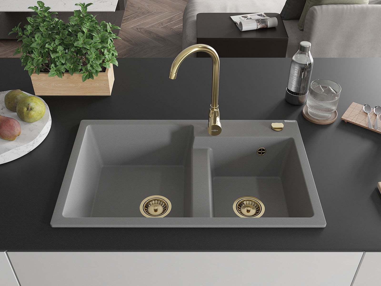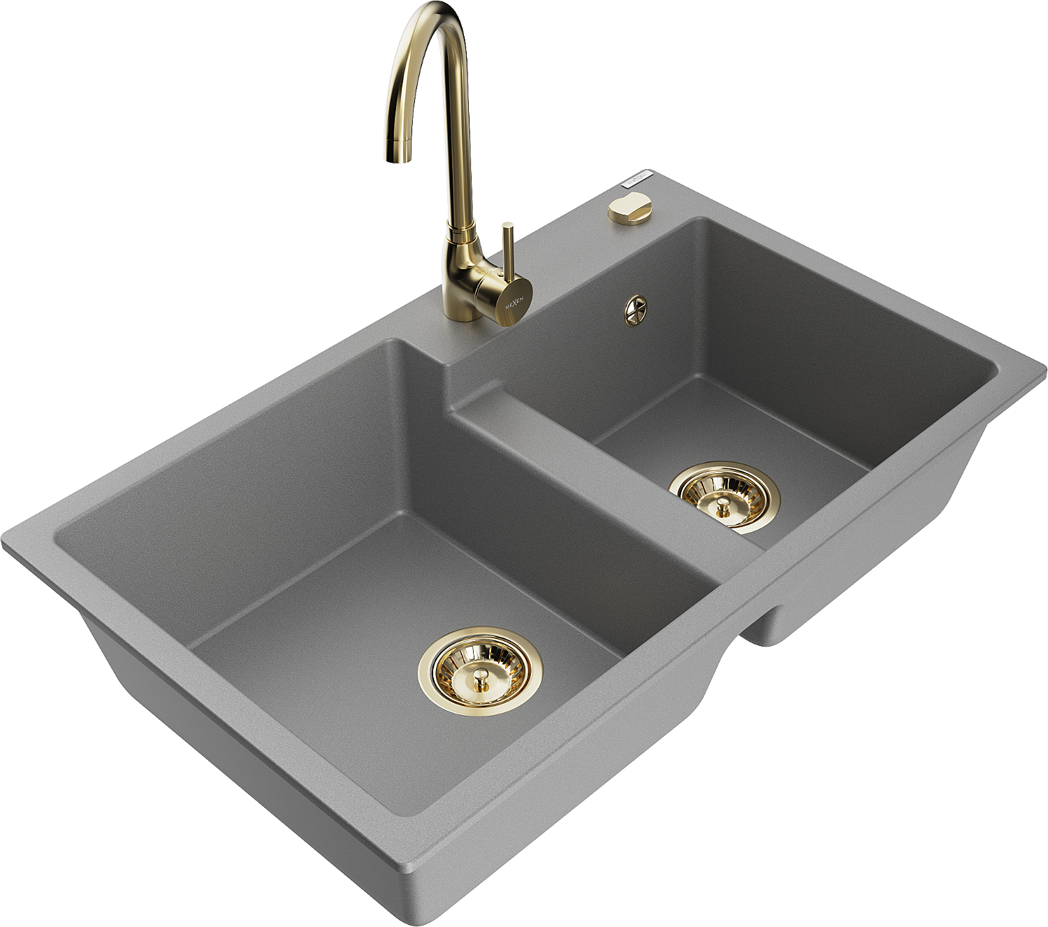 Mexen Tomas évier en granit à 2 bacs avec robinet de cuisine Telma, gris - 6516-71-670200-50