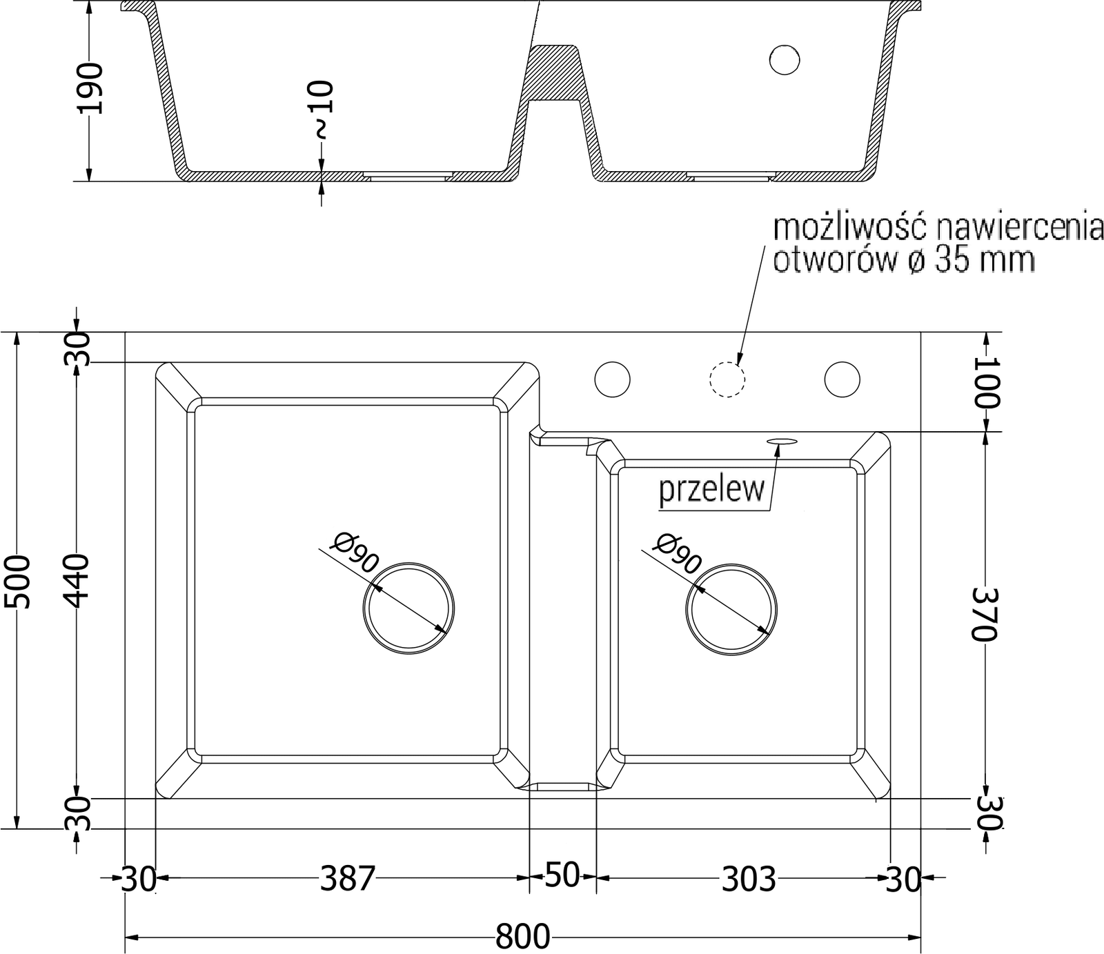 L'évier est doté d'un trou fraisé de 35 mm de diamètre pour l'auto-perçage. Il peut notamment accueillir un distributeur de liquide, ce qui éliminera les bouteilles en plastique dans la cuisine et lui apportera une finition élégante.