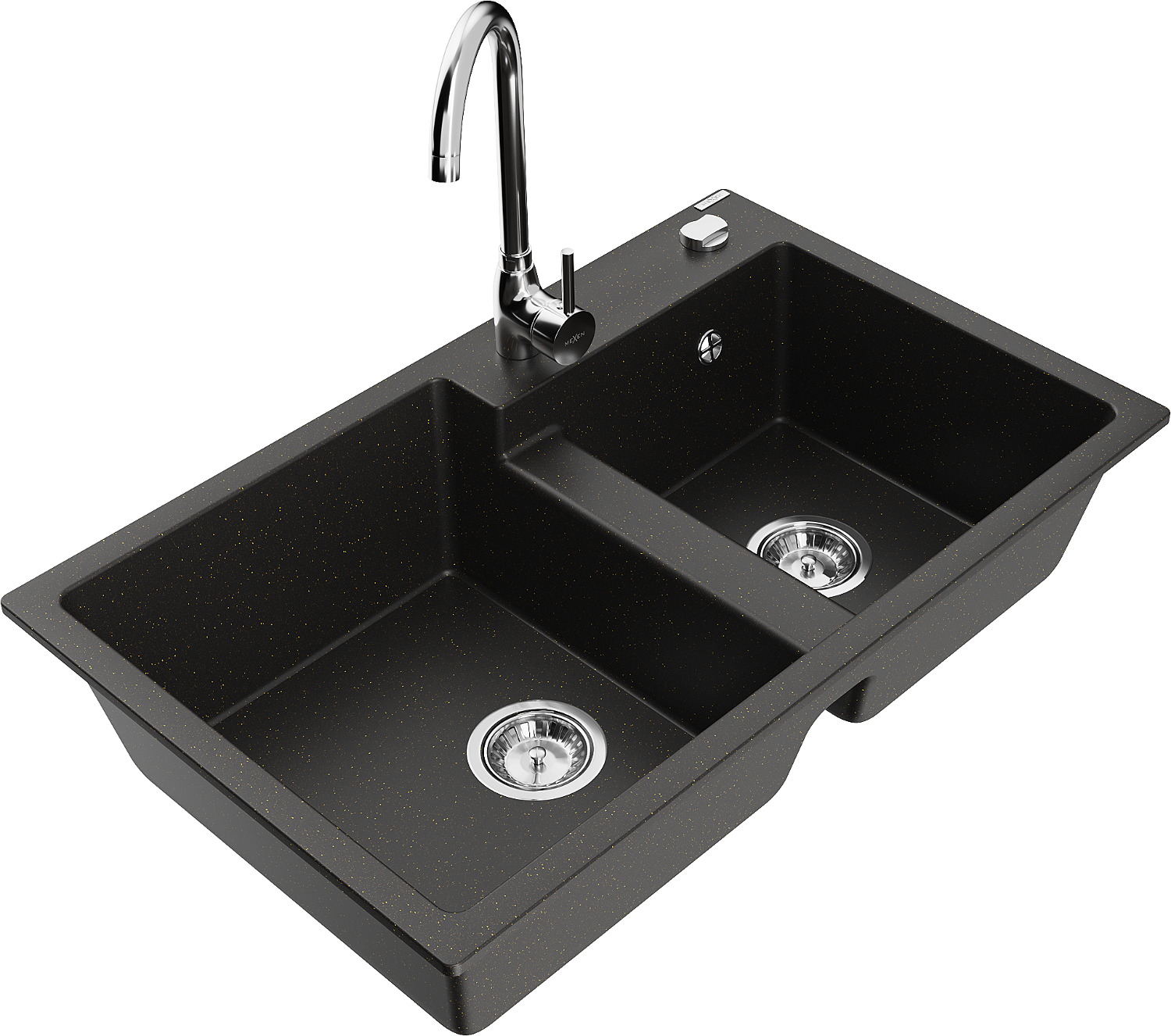 Mexen Tomas évier en granit 2 bacs avec robinet de cuisine Telma, noir/or métallique - 6516-75-670200-00