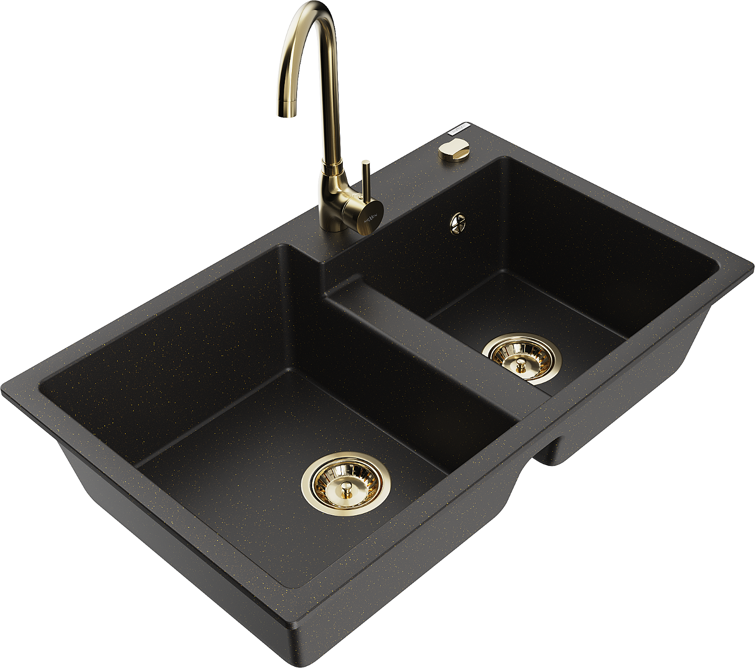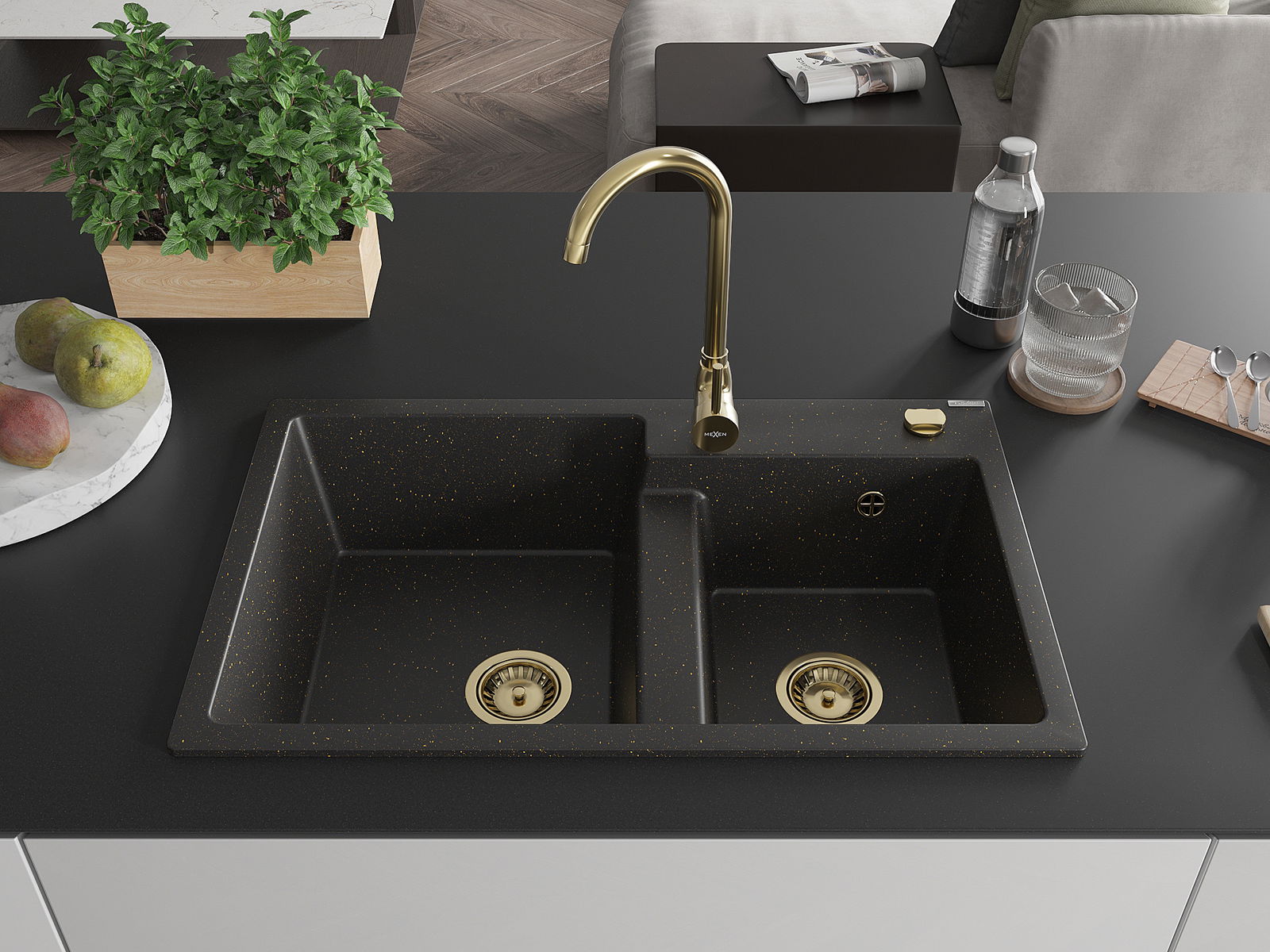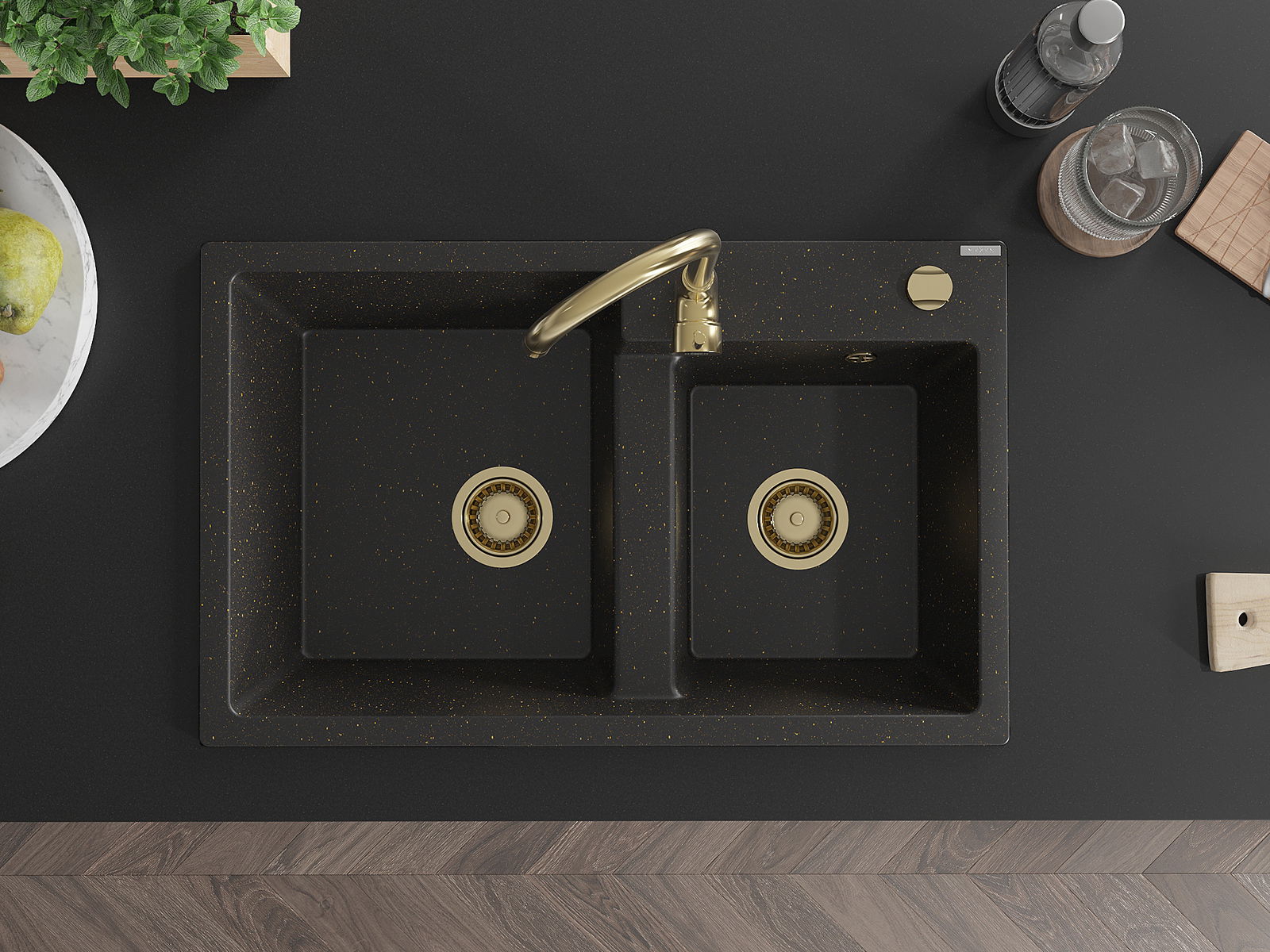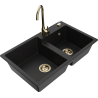Mexen Tomas évier en granit à 2 bacs avec robinet de cuisine Telma, noir/or métallisé - 6516-75-670200-50