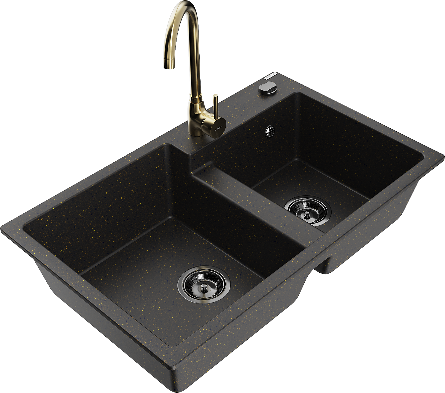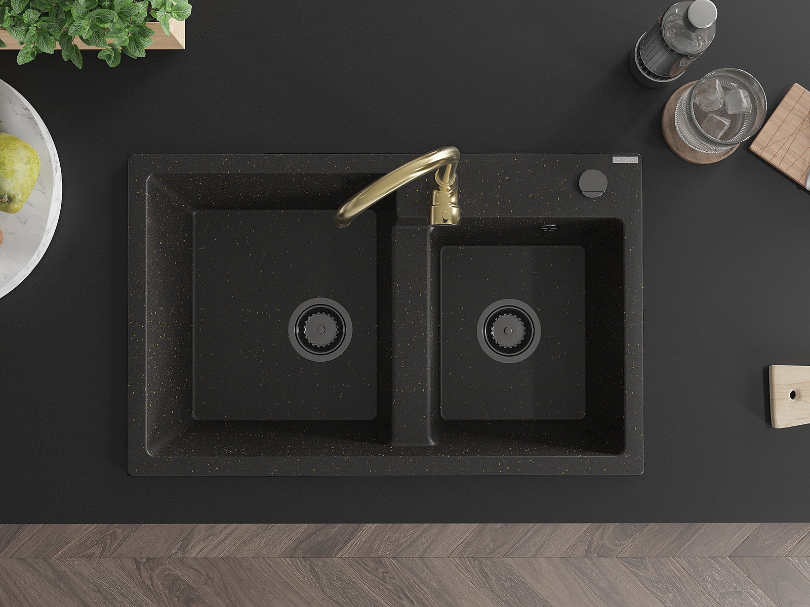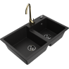 Mexen Tomas évier en granit à 2 bacs avec robinet de cuisine Telma, noir/doré métallisé - 6516-75-670200-50-B
