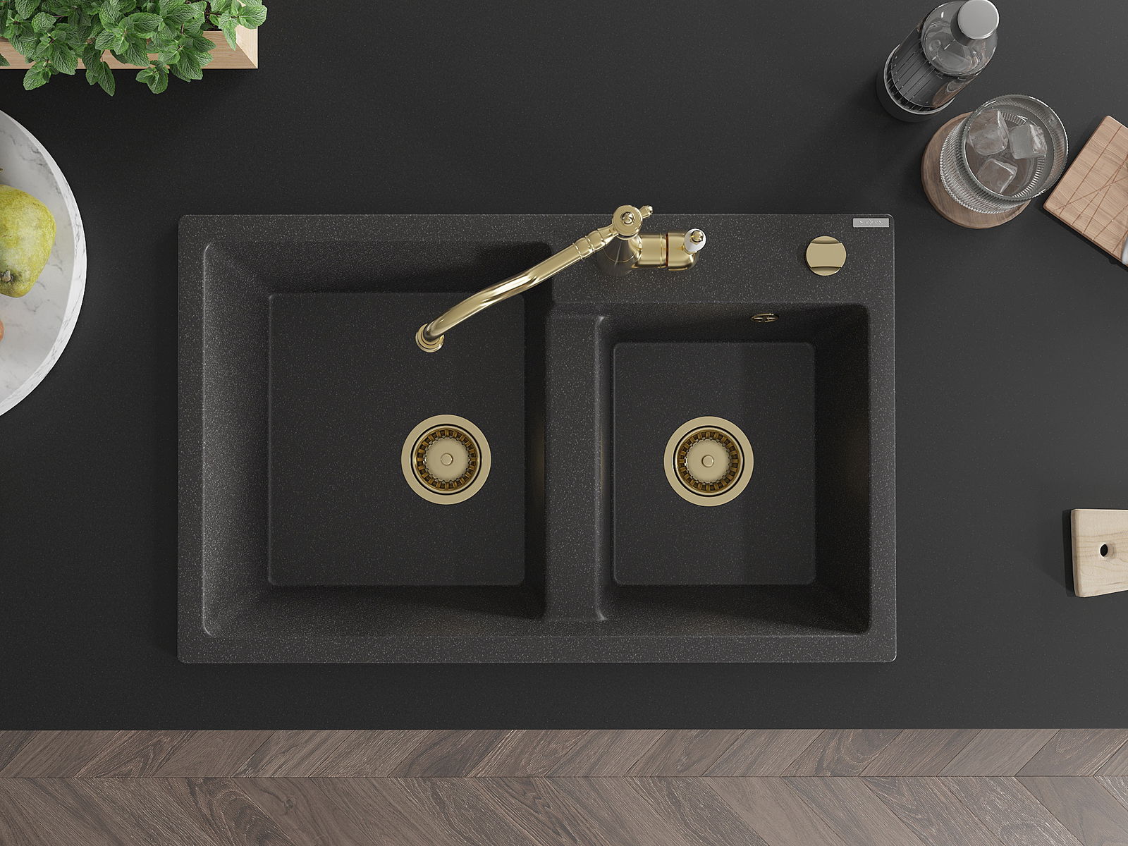 Mexen Tomas évier granit 2 bacs avec robinet de cuisine Carla, noir moucheté - 6516-76-670700-50
