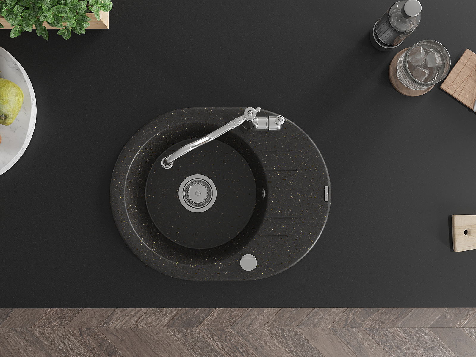 Mexen Kevin évier en granit à 1 bac avec égouttoir et robinet de cuisine Carla, noir/métallisé or - 6517-75-670700-00