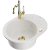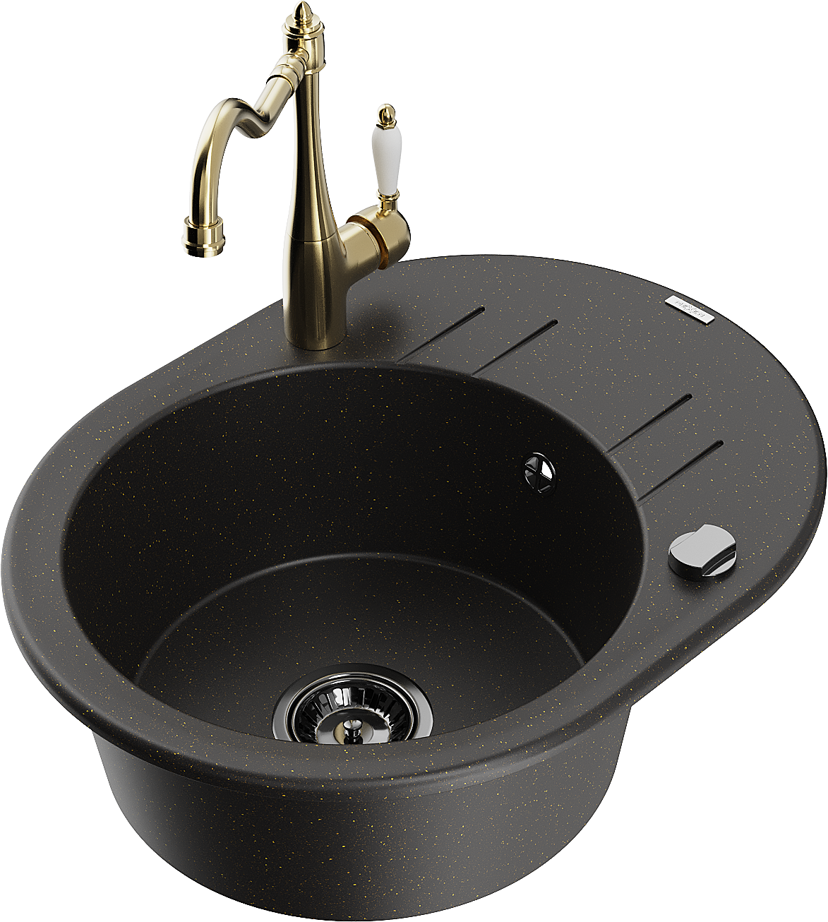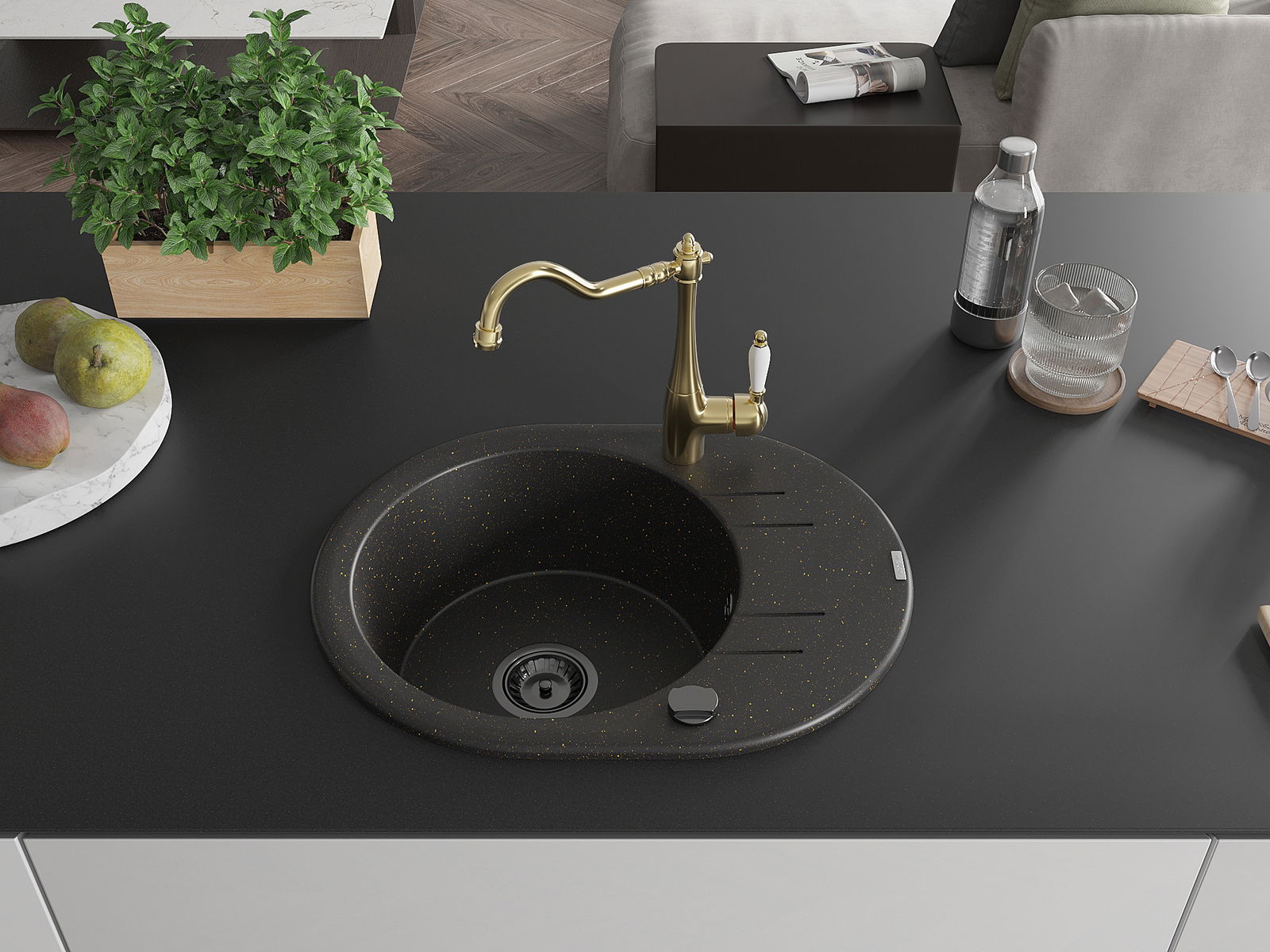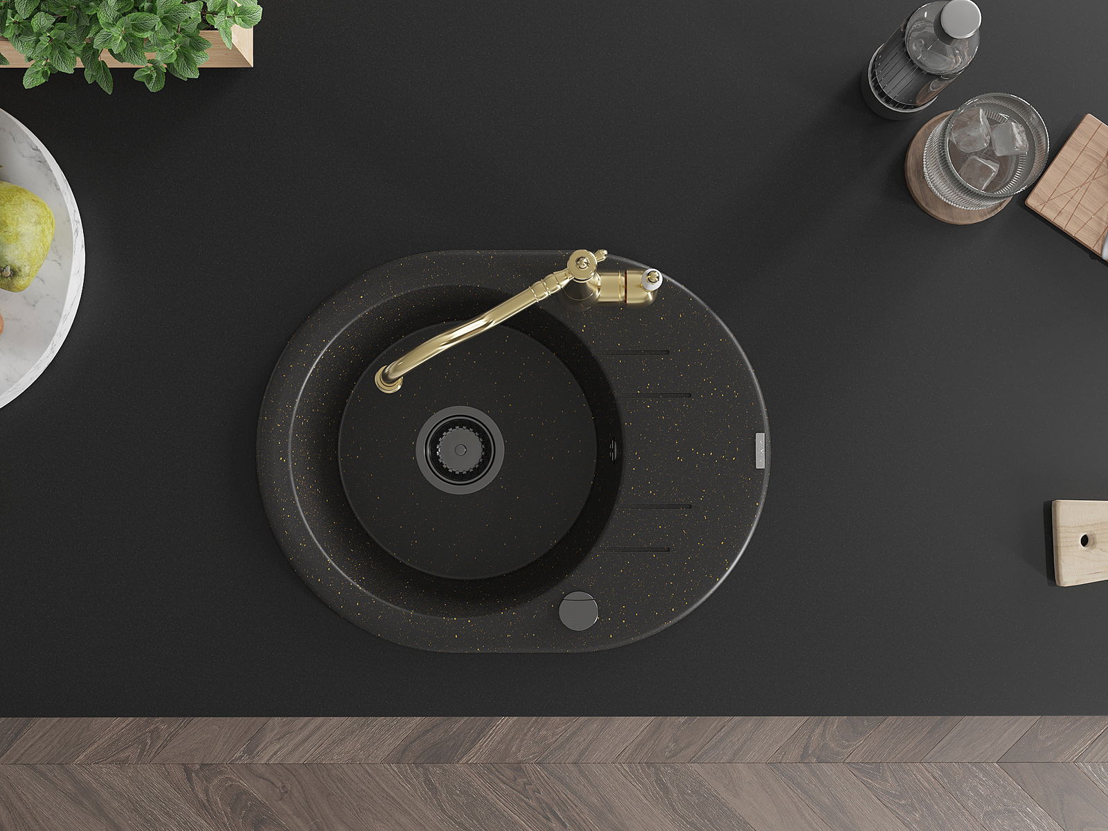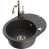 Mexen Kevin évier en granit 1 bac avec égouttoir et robinet de cuisine Carla, noir/doré métallique - 6517-75-670700-50-B