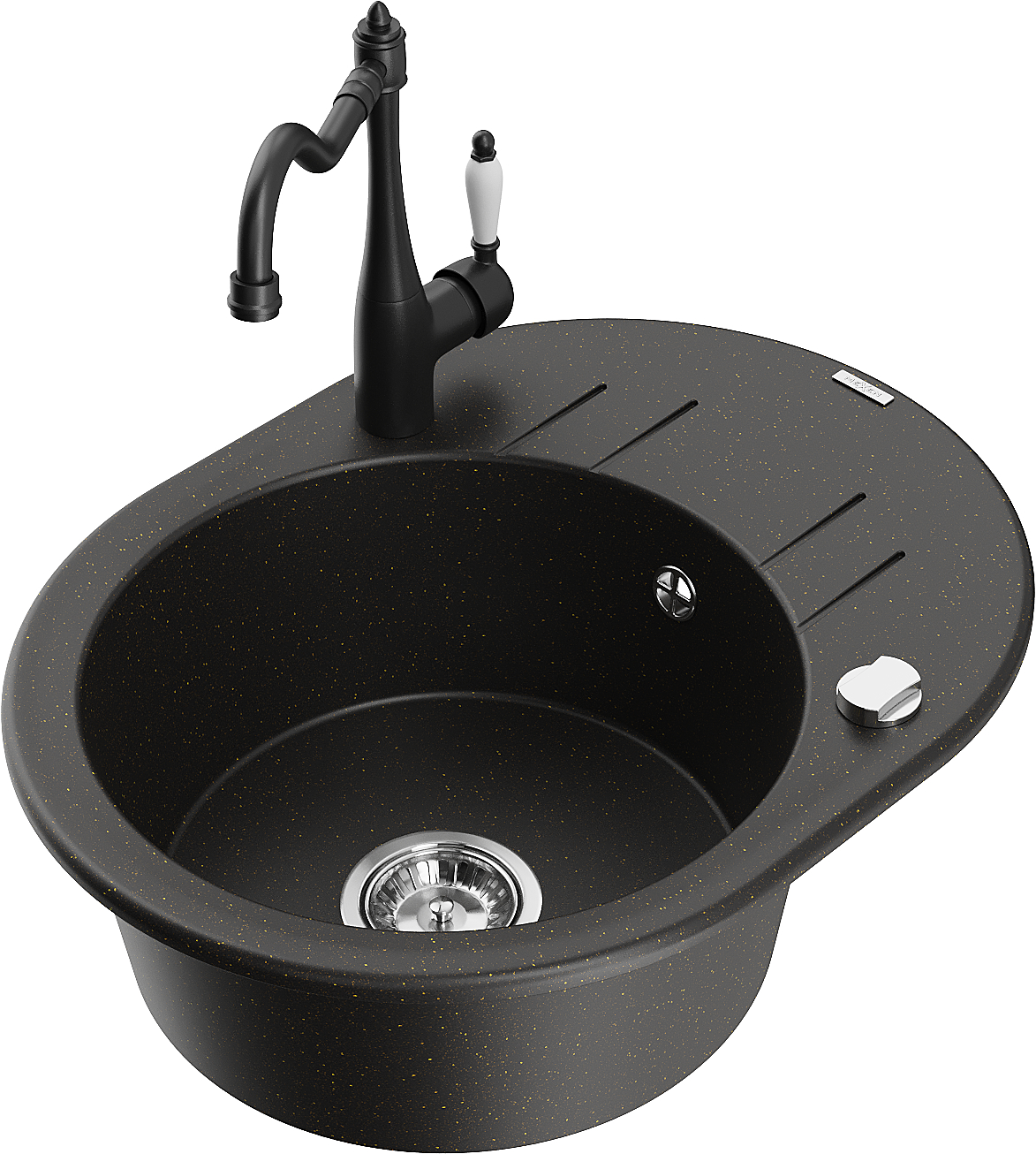Mexen Kevin évier en granit 1 bac avec égouttoir et robinet de cuisine Carla, noir/or métallisé - 6517-75-670700-70