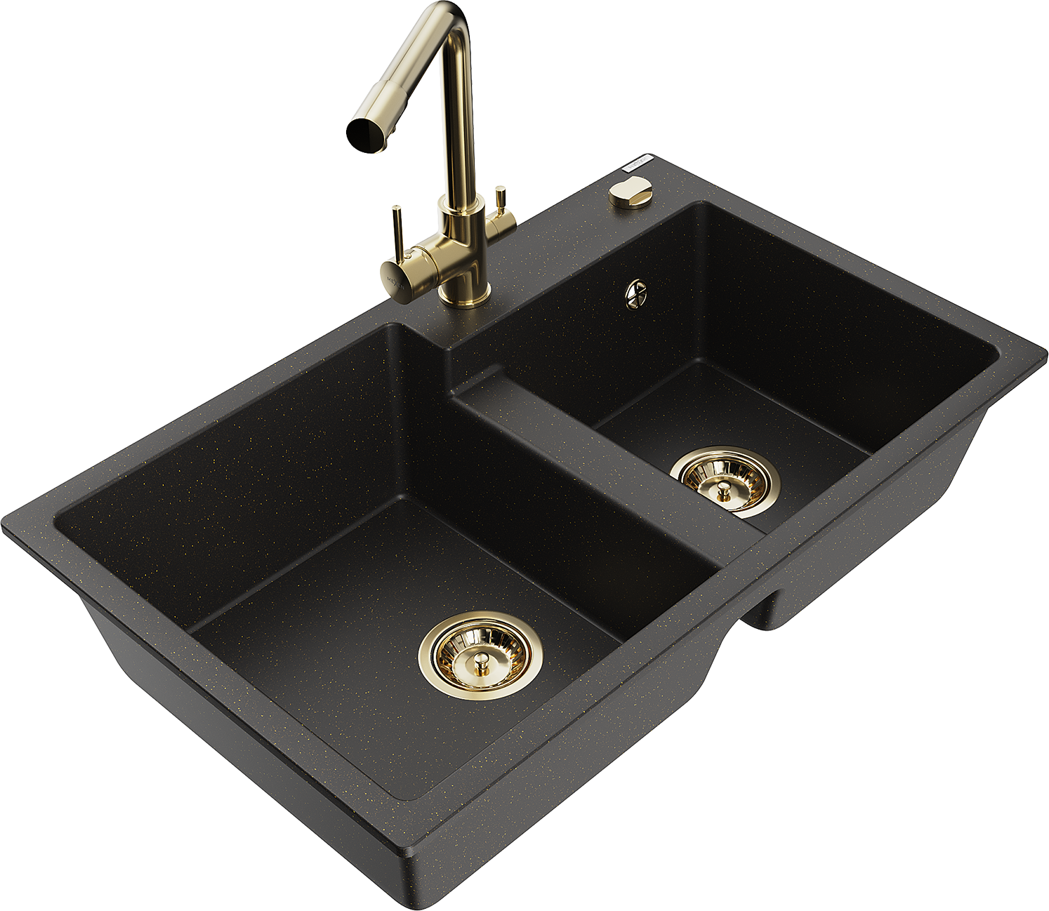 Mexen Tomas évier en granit à 2 bacs avec robinet de cuisine Duero, noir/doré métallique - 6516-75-671600-50