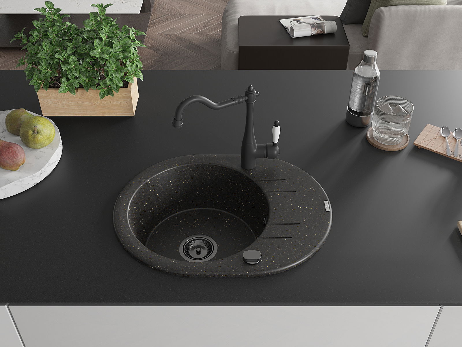 Mexen Kevin évier en granit 1 bac avec égouttoir et robinet de cuisine Carla, noir/métallisé doré - 6517-75-670700-70-B