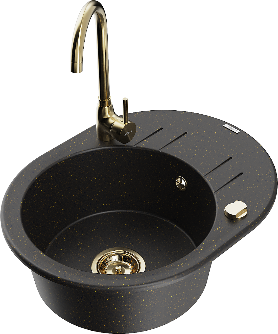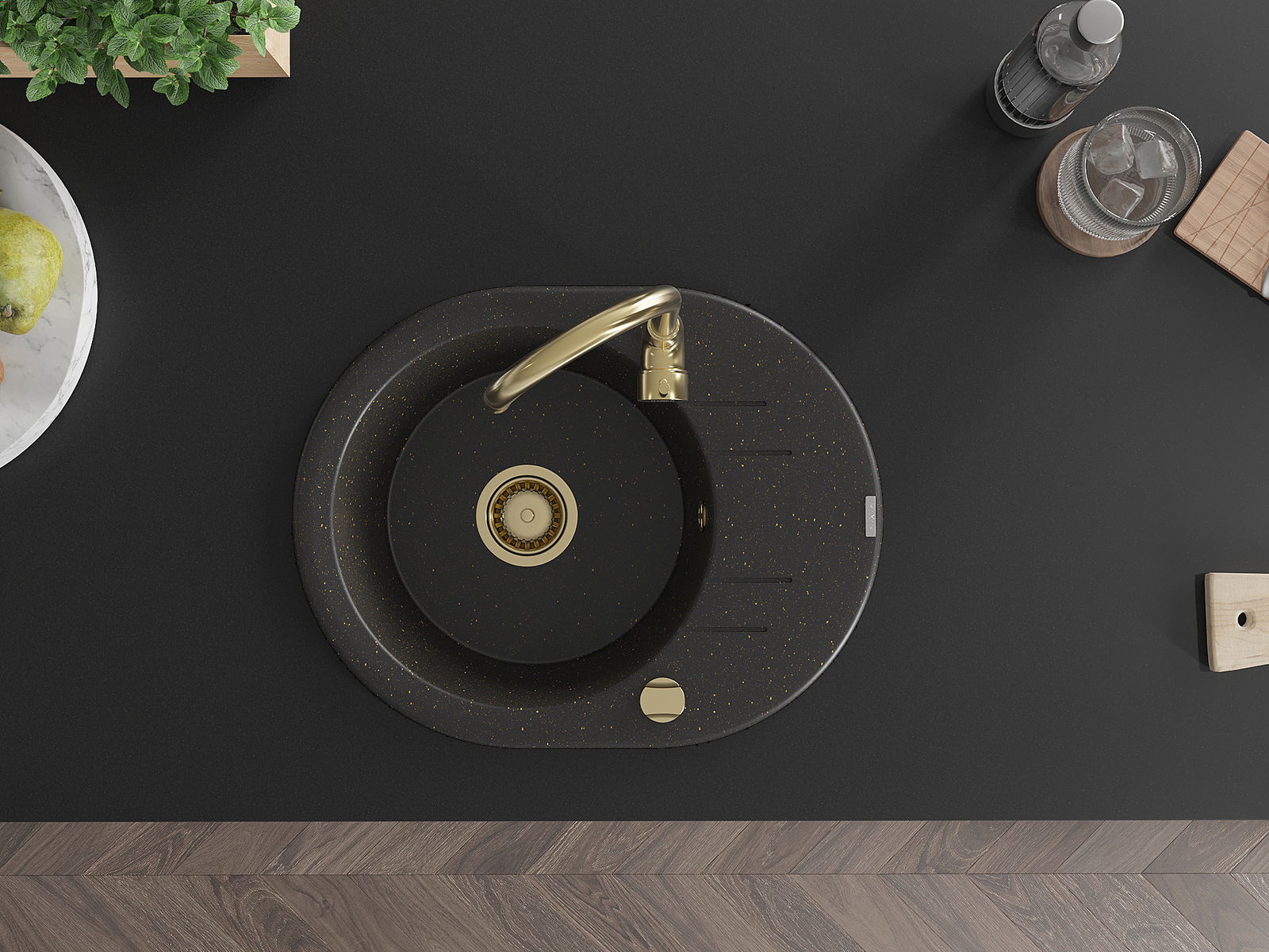 Mexen Kevin évier en granit à 1 bac avec égouttoir et robinet de cuisine Telma, noir/métallique doré - 6517-75-670200-50