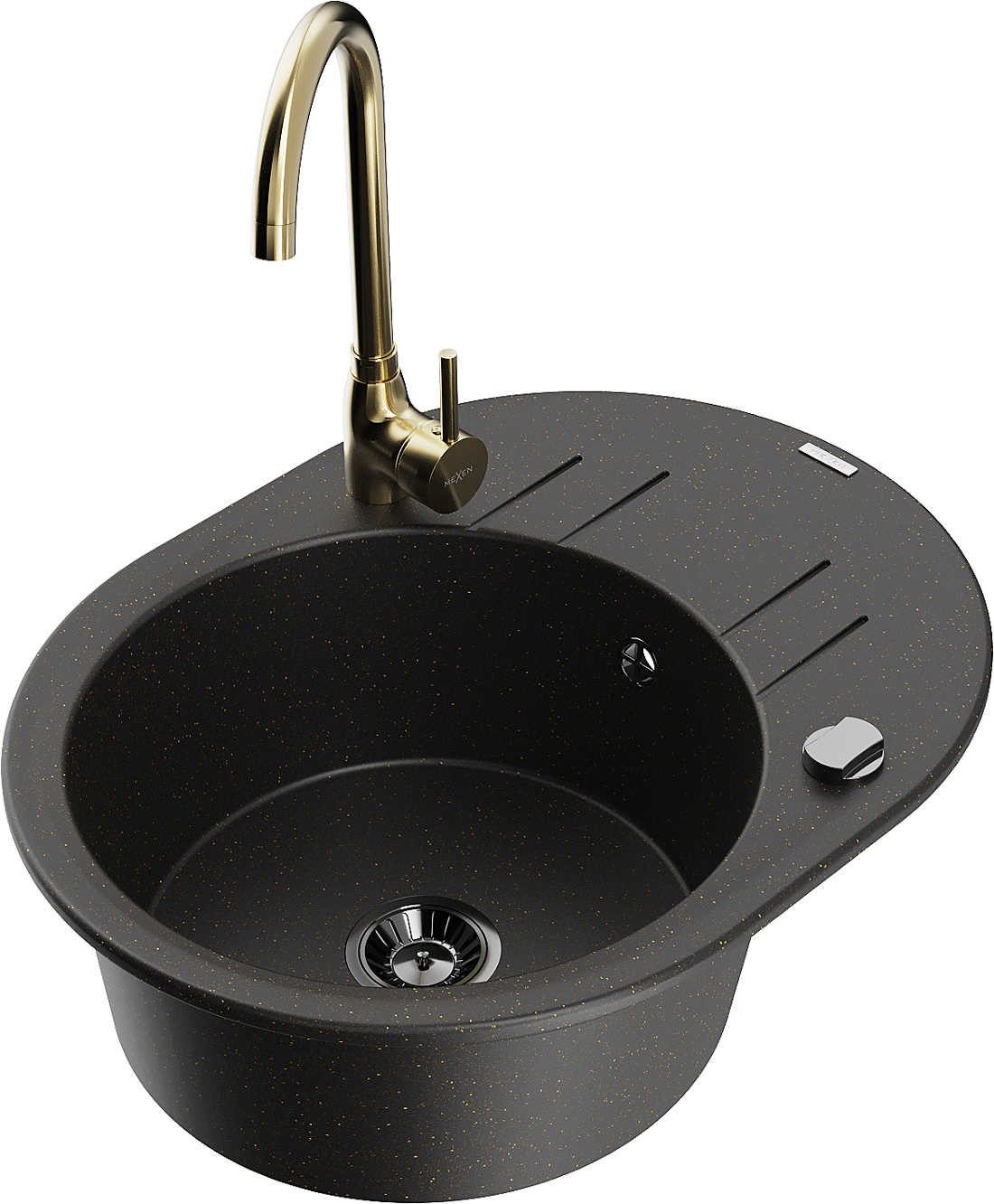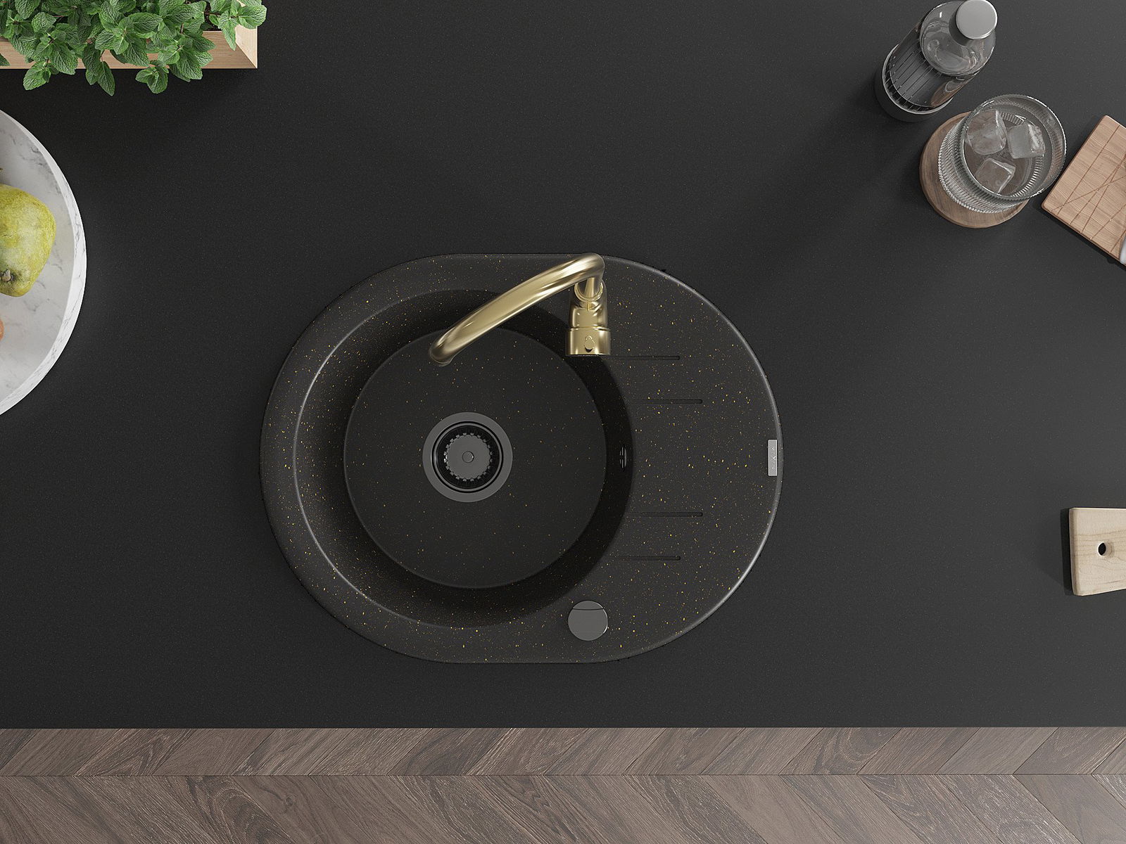 Mexen Kevin évier en granit 1 bac avec égouttoir et robinet de cuisine Telma, noir/or métallique - 6517-75-670200-50-B