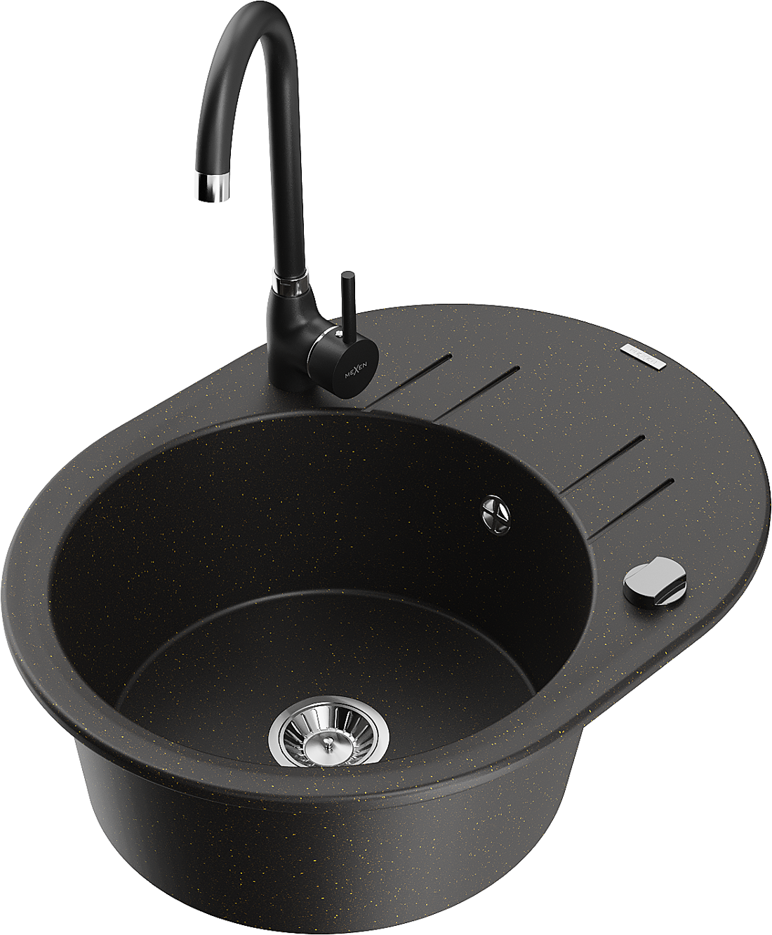 Mexen Kevin évier en granit 1 bac avec égouttoir et robinet de cuisine Telma, noir/or métallique - 6517-75-670200-70