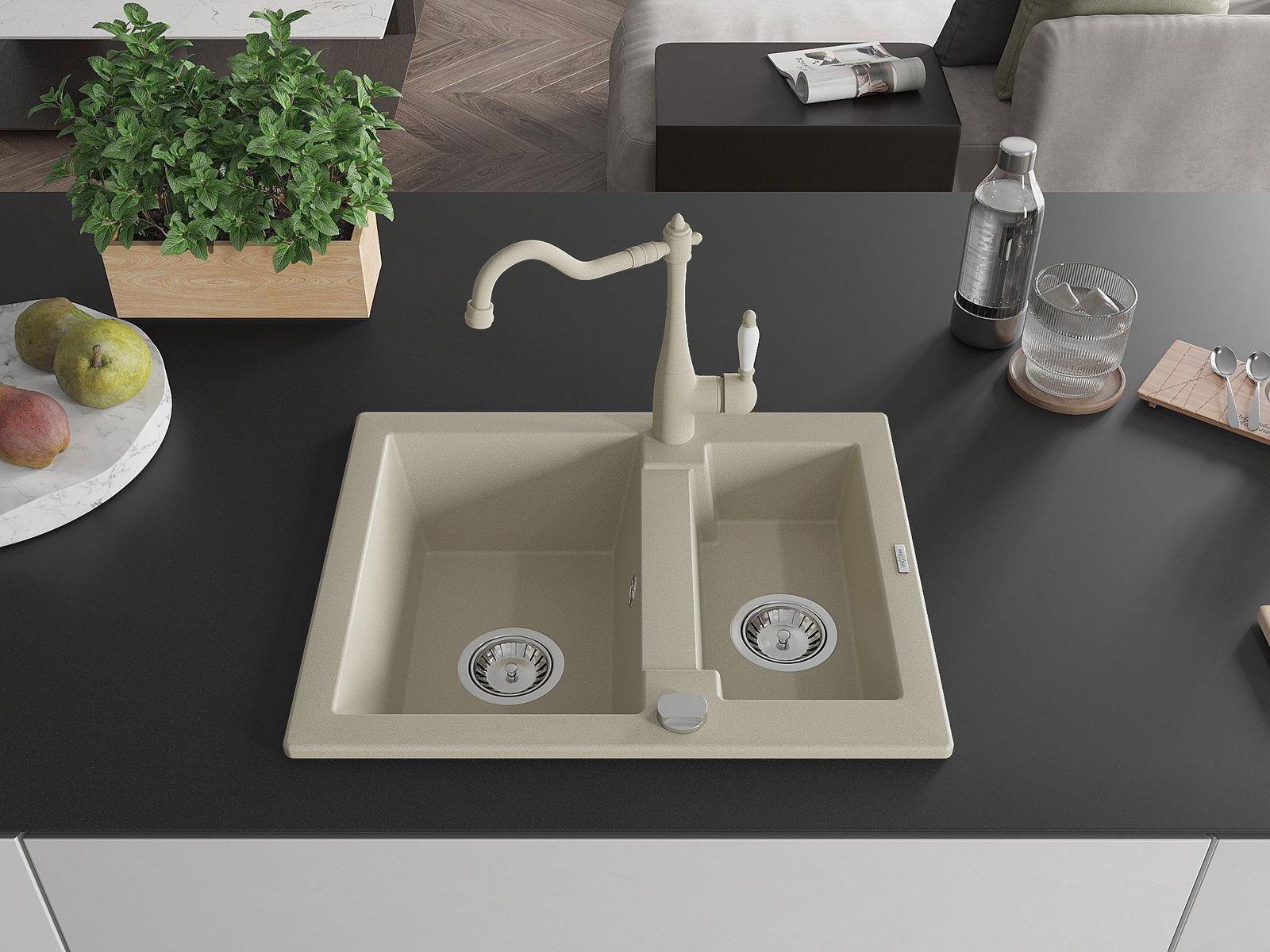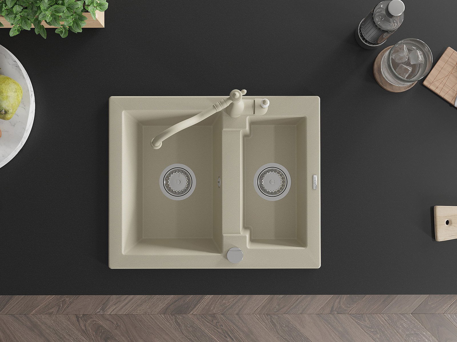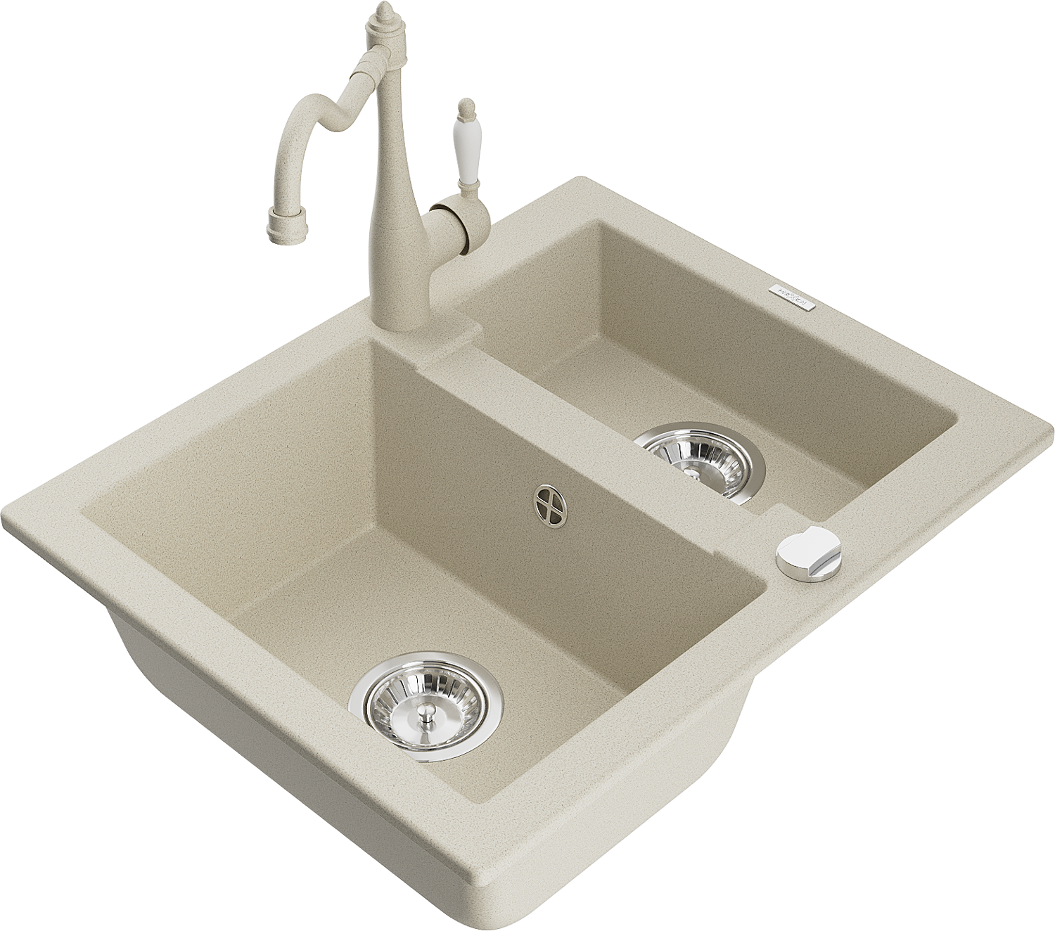 Mexen Carlos évier en granit à 1,5 bac avec robinet de cuisine Carla, beige - 6518-69-670700-69