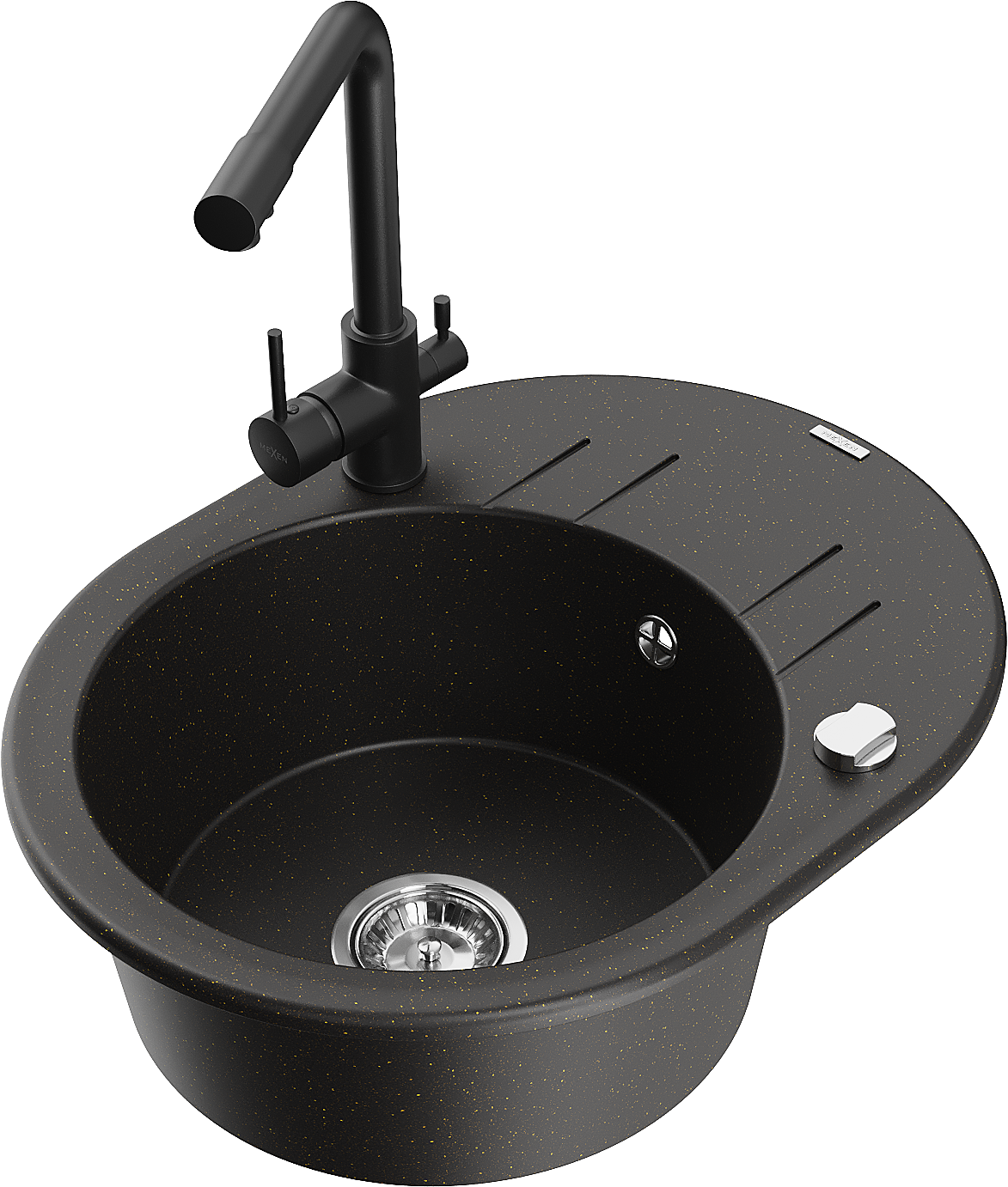 Mexen Kevin évier en granit 1 bac avec égouttoir et robinet de cuisine Duero, noir/or métallique - 6517-75-671600-70