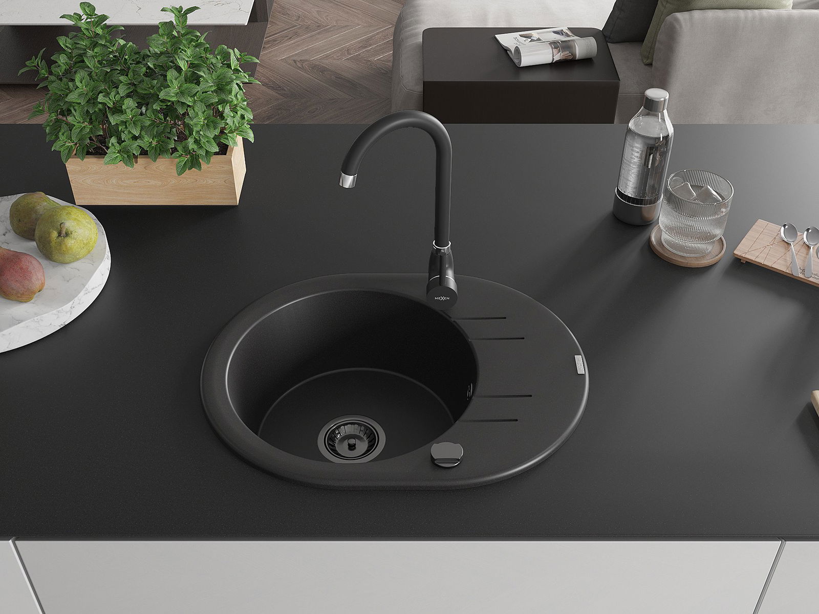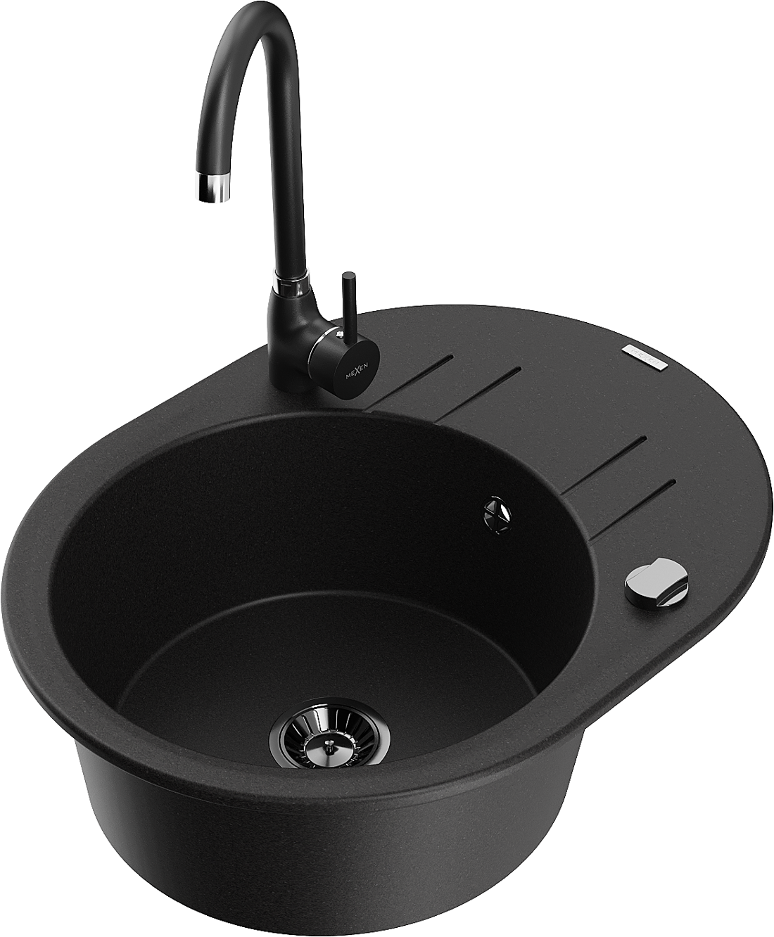 Mexen Kevin évier en granit 1 bac avec égouttoir et mitigeur de cuisine Telma, noir - 6517-77-670200-70-B