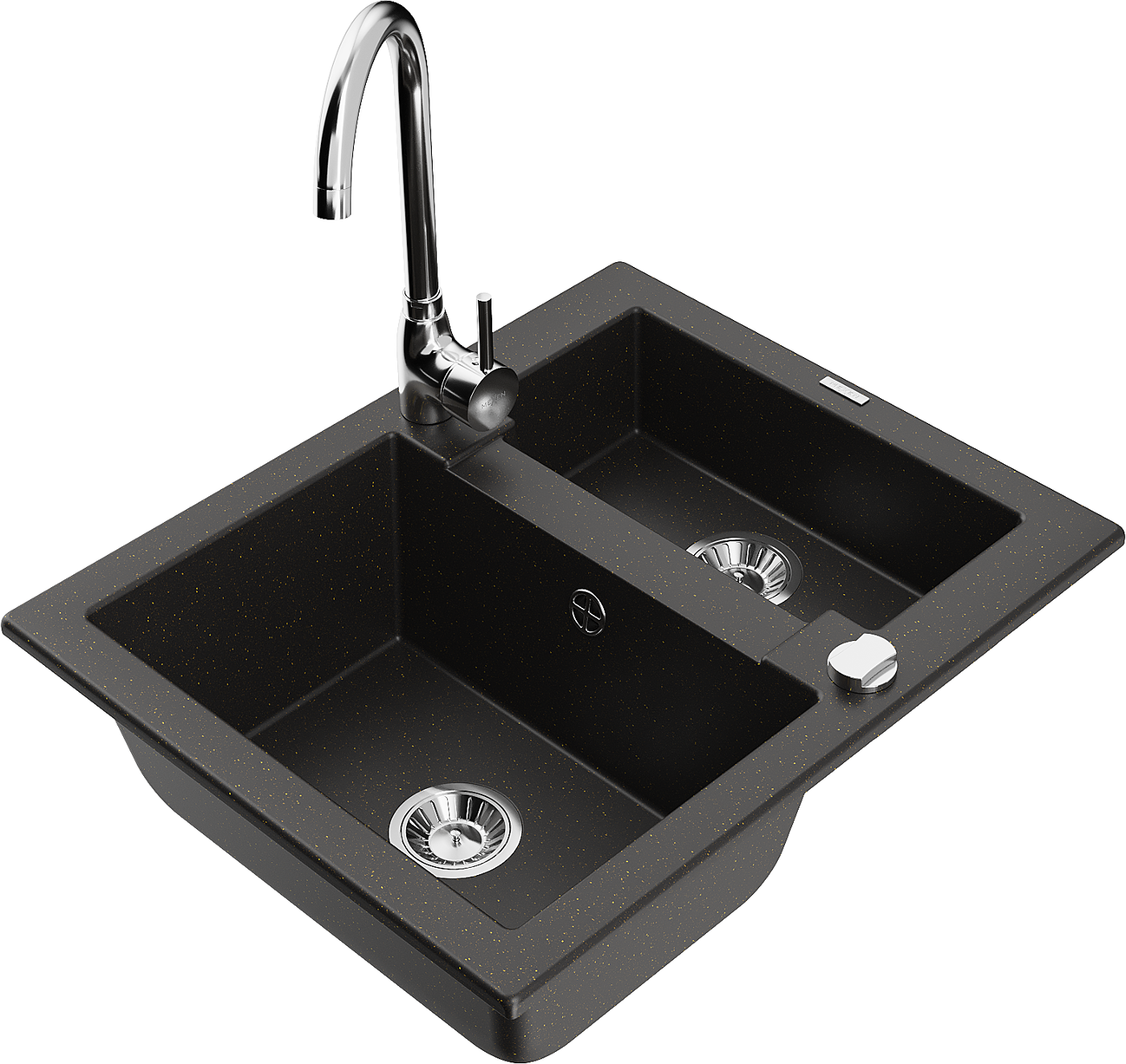 Mexen Carlos évier en granit 1,5-bac avec mitigeur de cuisine Telma, noir/or métallisé - 6518-75-670200-00