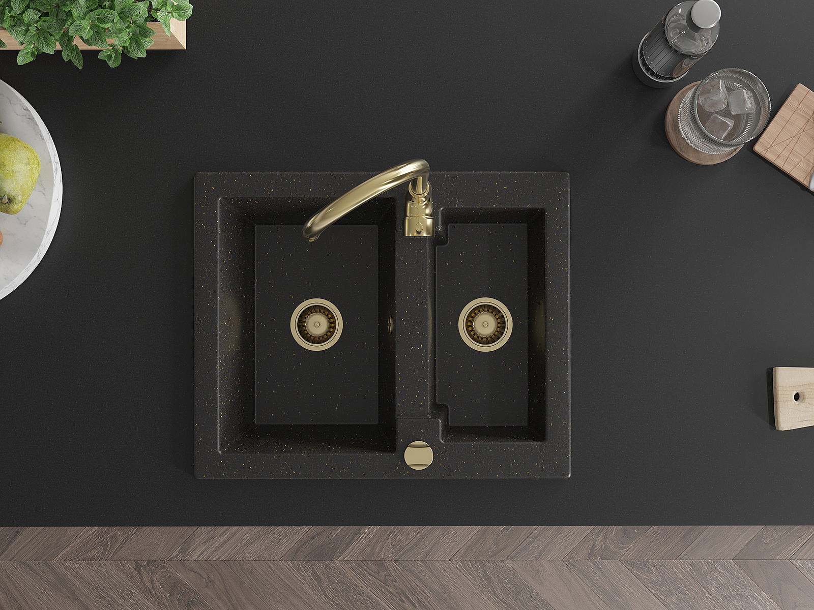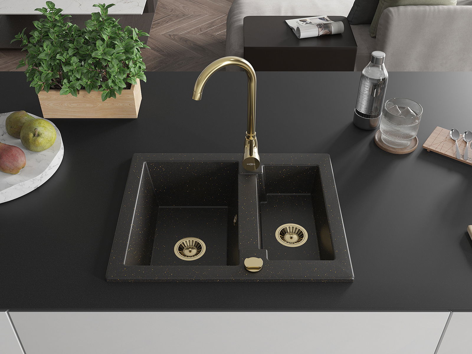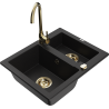 Mexen Carlos évier en granit 1,5 bac avec robinet de cuisine Telma, noir/or métallique - 6518-75-670200-50