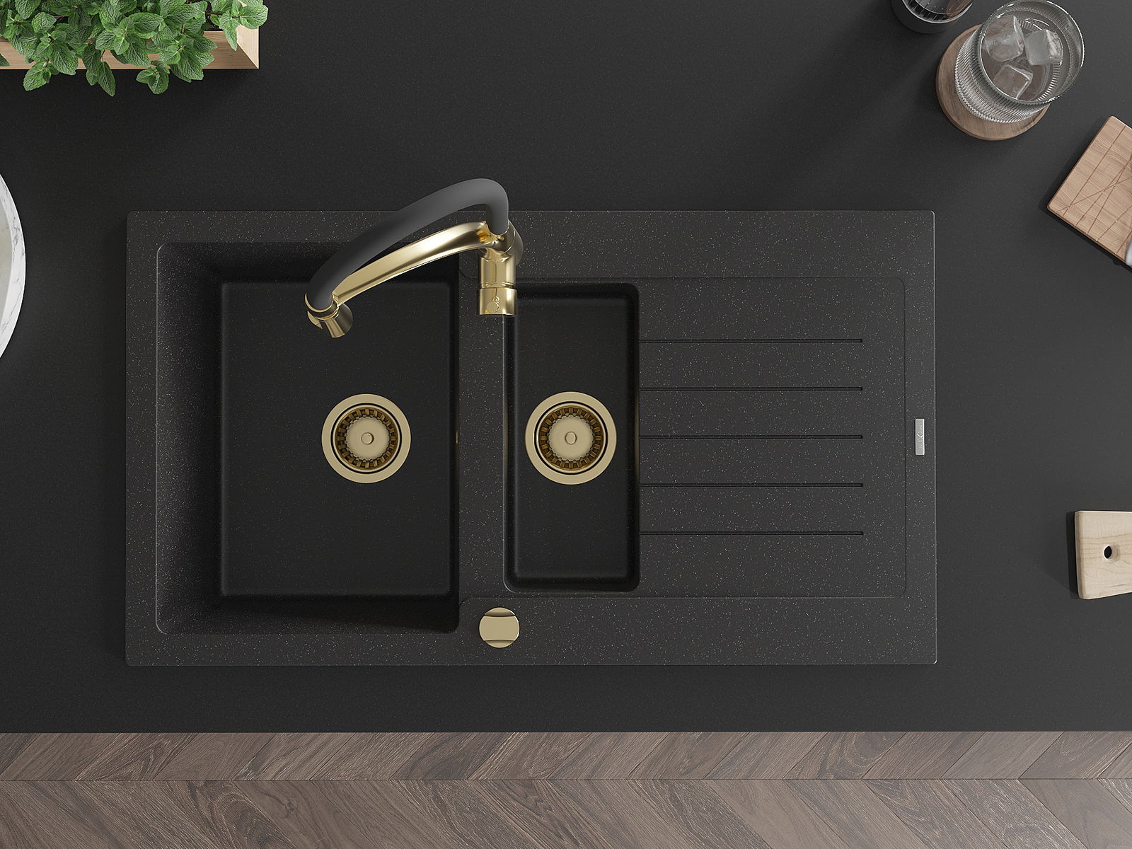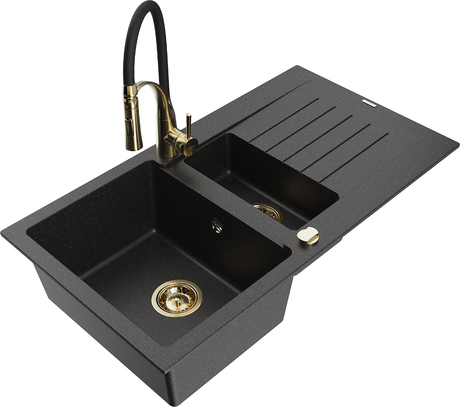 Mexen Matias évier en granit 1,5-bac avec égouttoir et robinet de cuisine Aster, noir/argenté - 6502-73-73450-57-G