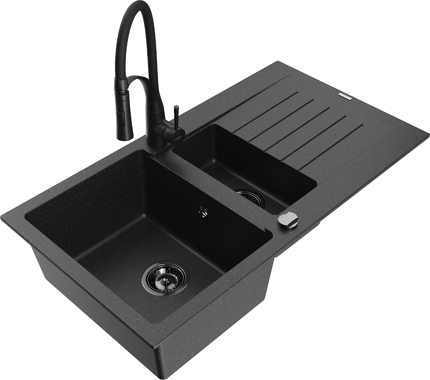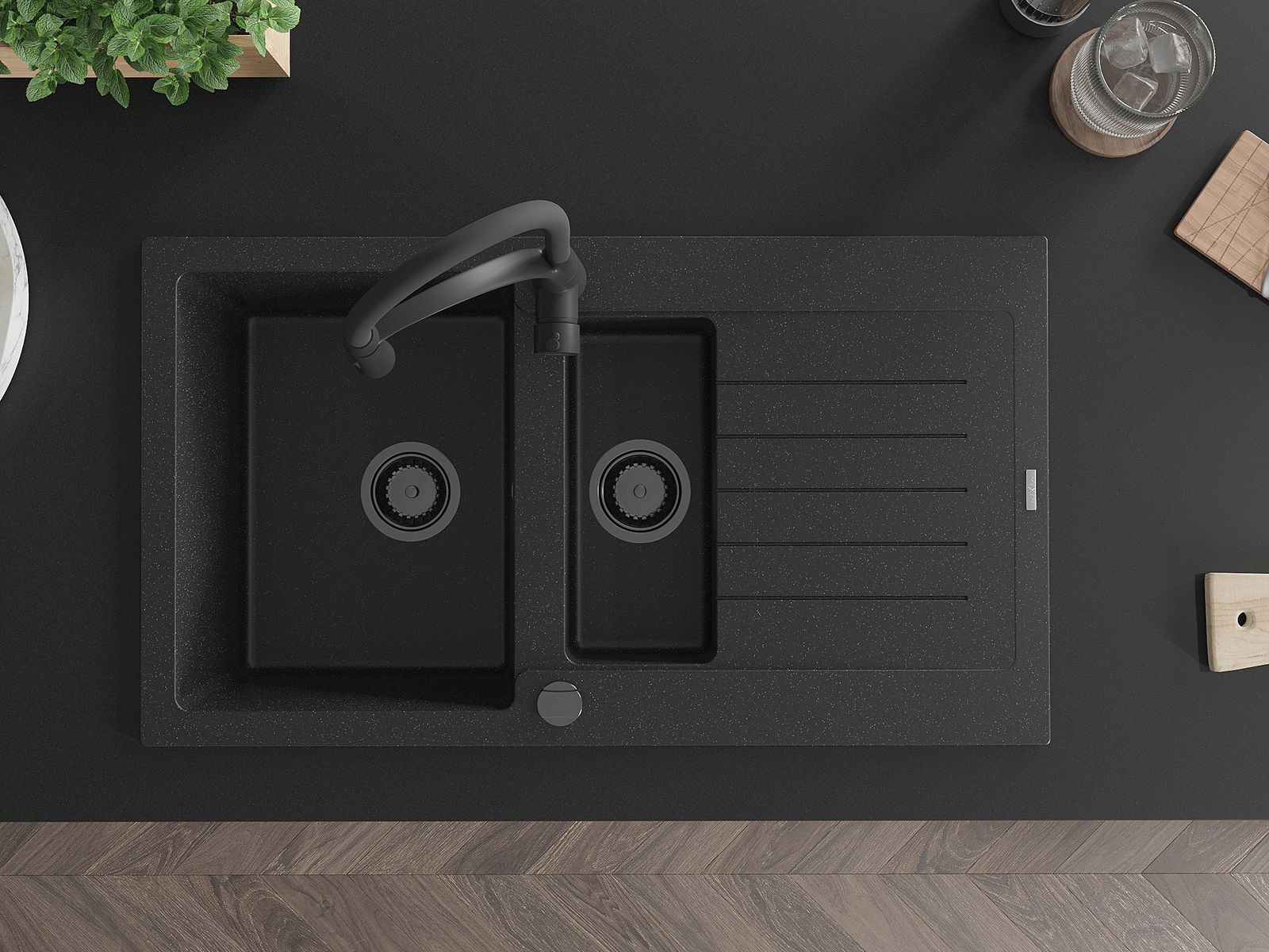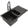 Mexen Matias évier en granit 1,5 bac avec égouttoir et robinet de cuisine Aster, noir/argent - 6502-73-73450-70-B